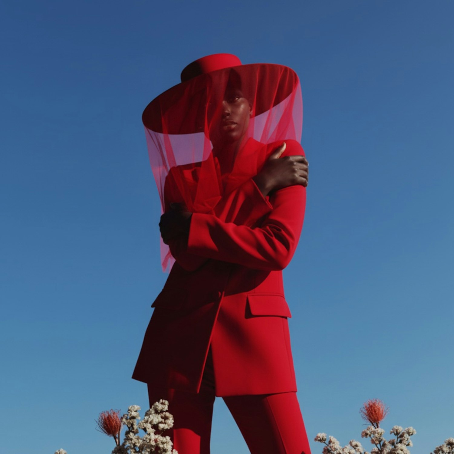 A person in a bold red suit and hat with a veil stands confidently against a blue sky, surrounded by flowers in the foreground.