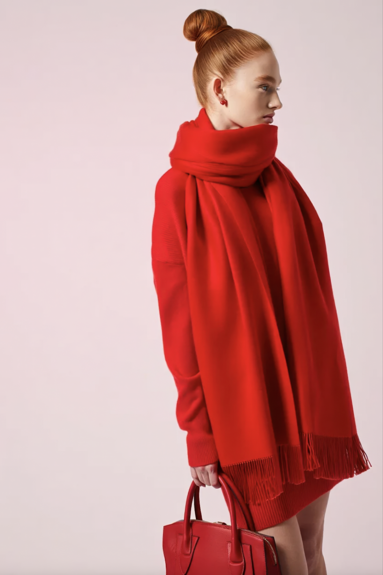 Stylish woman in a red outfit with a matching scarf and handbag, set against a soft pink background. Perfect for fashion inspiration.