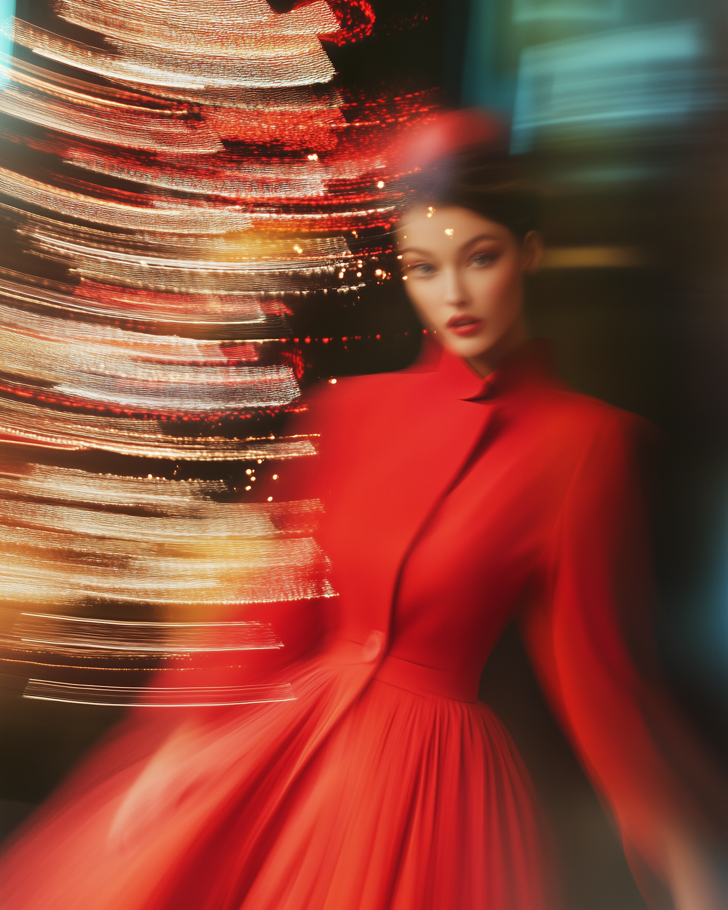 Elegant woman in a red dress with blurred motion and festive lights, creating a dynamic and artistic holiday atmosphere.
