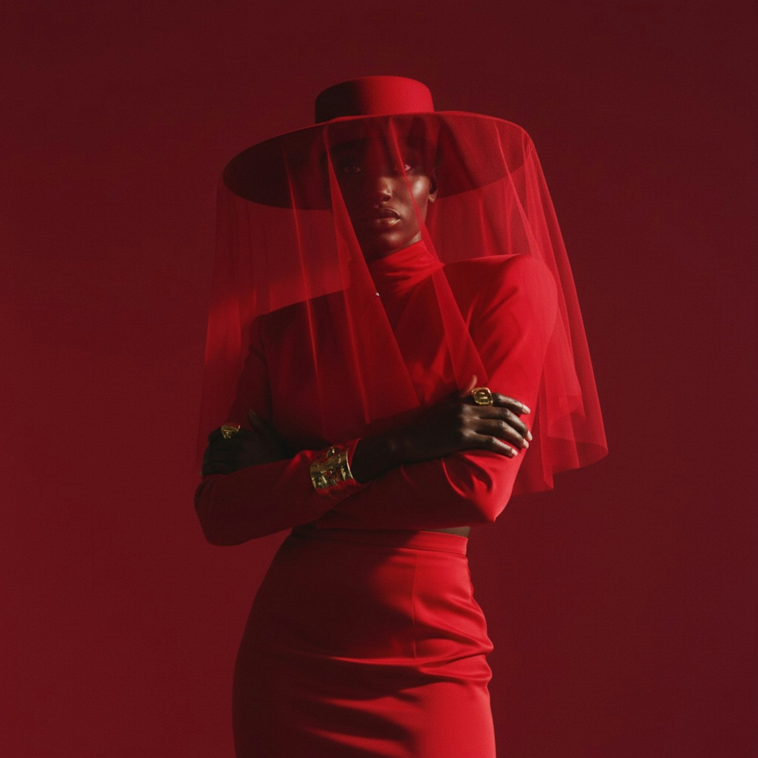 A person in a red outfit with a wide-brimmed hat and veil, accessorized with gold jewelry, against a red background.