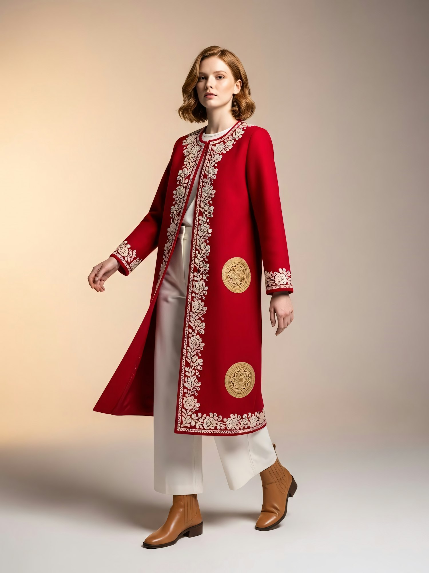 A woman in a red embroidered coat with white trousers and tan boots, set against a softly lit beige background.