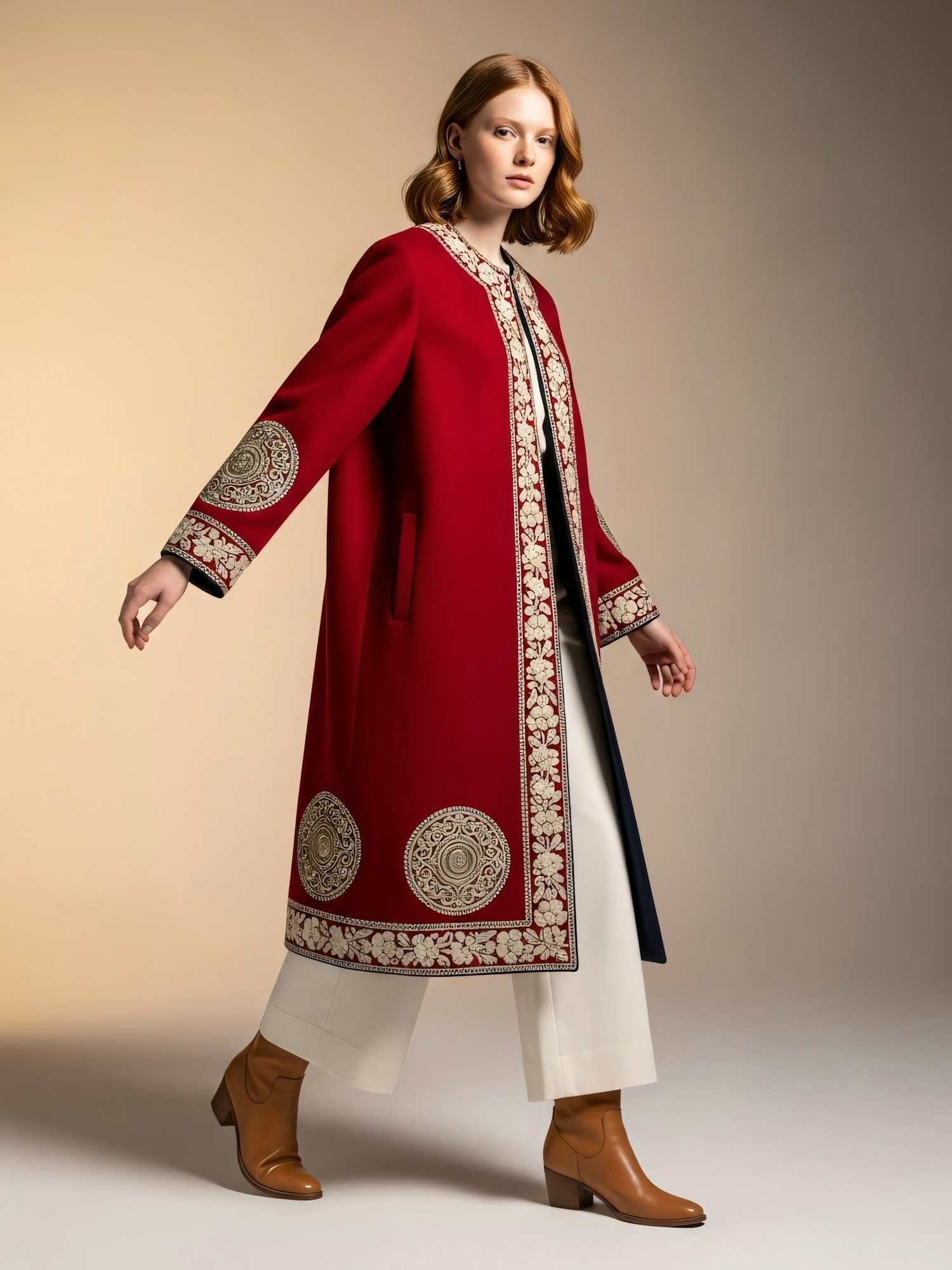 A stylish woman in a red embroidered coat, white trousers, and tan boots, posing confidently against a warm-toned background.