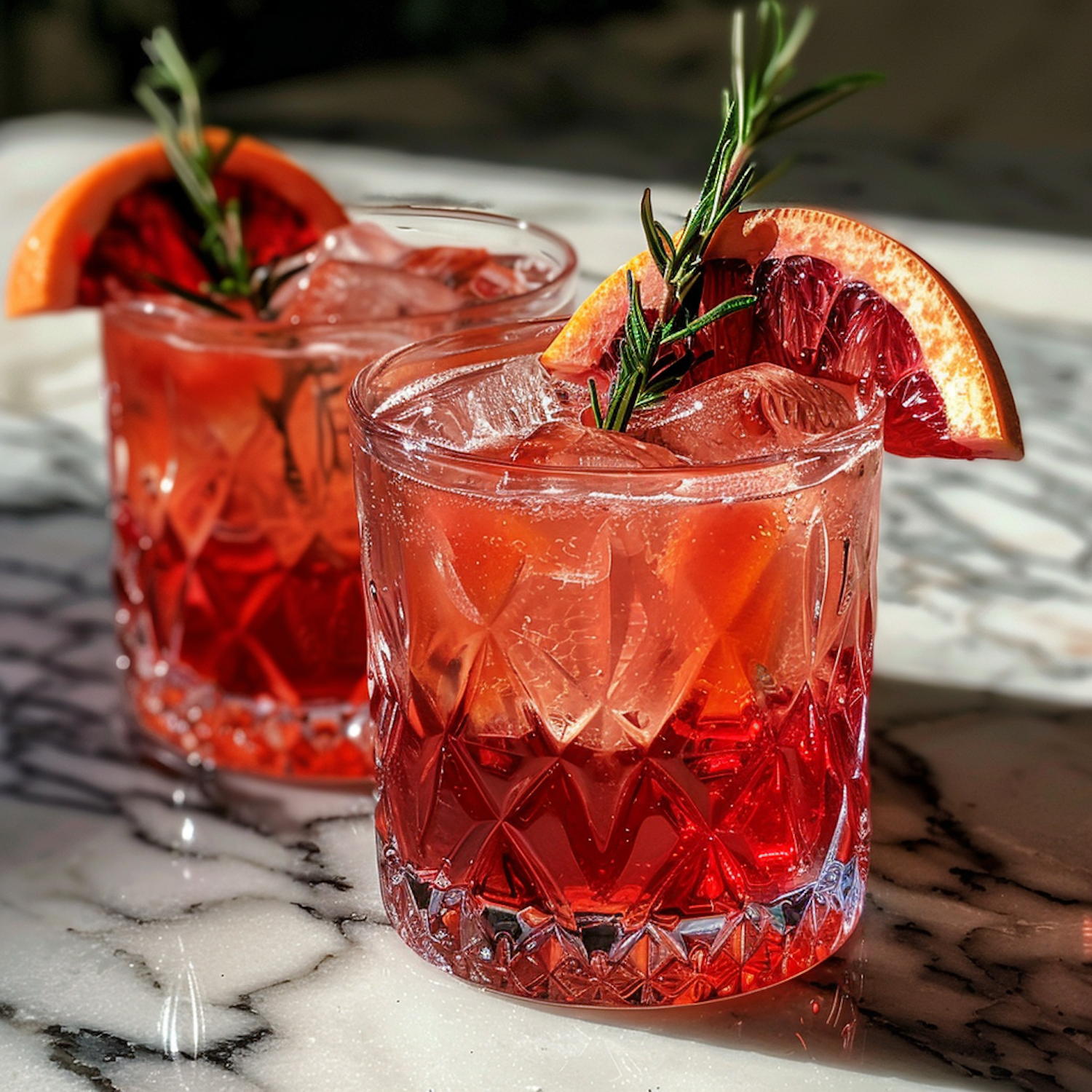 Elegant red cocktails in crystal glasses with blood orange and rosemary garnish on a marble surface, bathed in natural light.