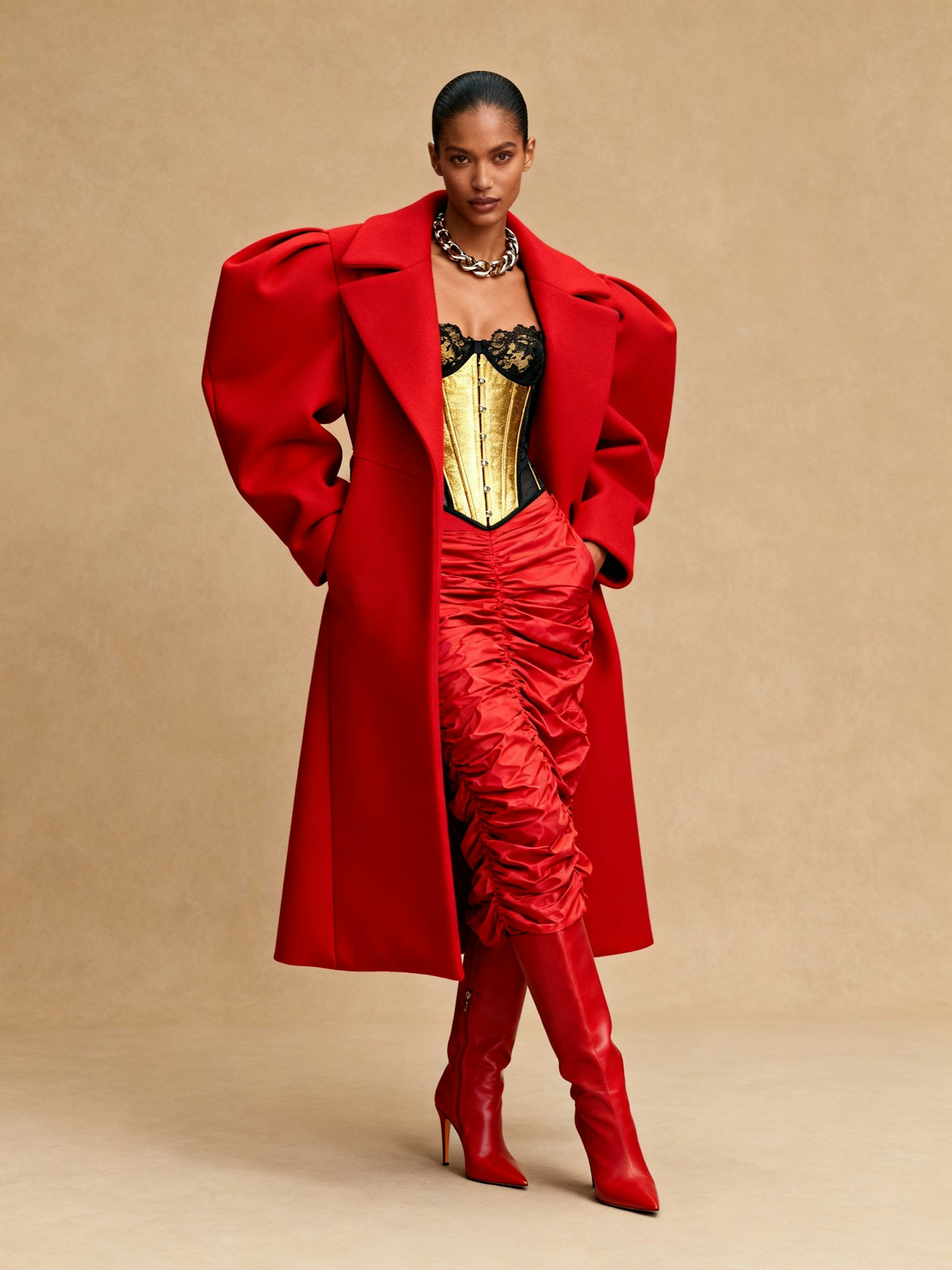 A confident woman standing against a plain background that complements her warm brown skin tone, wearing a voluminous red coat with exaggerated shoulder pads layered over a gold and black lace corset. She pairs it with a crinkled red skirt or pants and matching red high-heeled boots, creating a sculptural silhouette. Her sleek, pulled-back hair and chunky necklace add editorial polish. The composition blends bold color blocking, dramatic proportions, and high-fashion elegance with a touch of urban edge