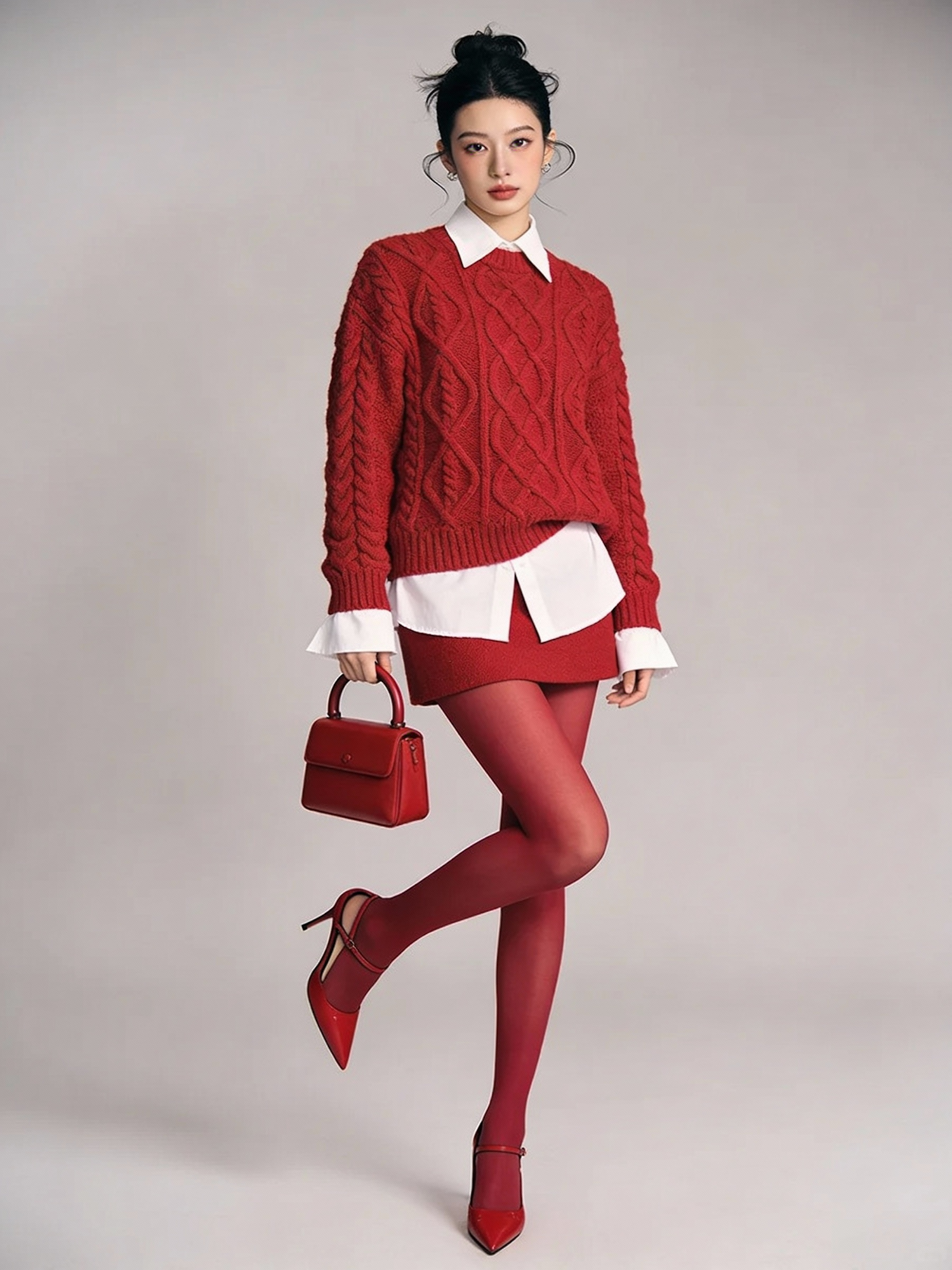 A fashion-forward editorial image of a stylish woman standing against a soft light gray studio backdrop. She wears a chunky red cable-knit sweater layered over a crisp white collared shirt, with the shirt’s cuffs and hem visibly extending. Her outfit includes a short red skirt, opaque red tights, and red pointed-toe high heels with thin back straps. She holds a small structured red handbag with a top handle. The look is monochromatic, bold, and cohesive, styled for fall/winter. Lighting is soft and diffused, emphasizing texture and color harmony. Her pose is confident and elegant, evoking emotional resonance and high-fashion storytelling.