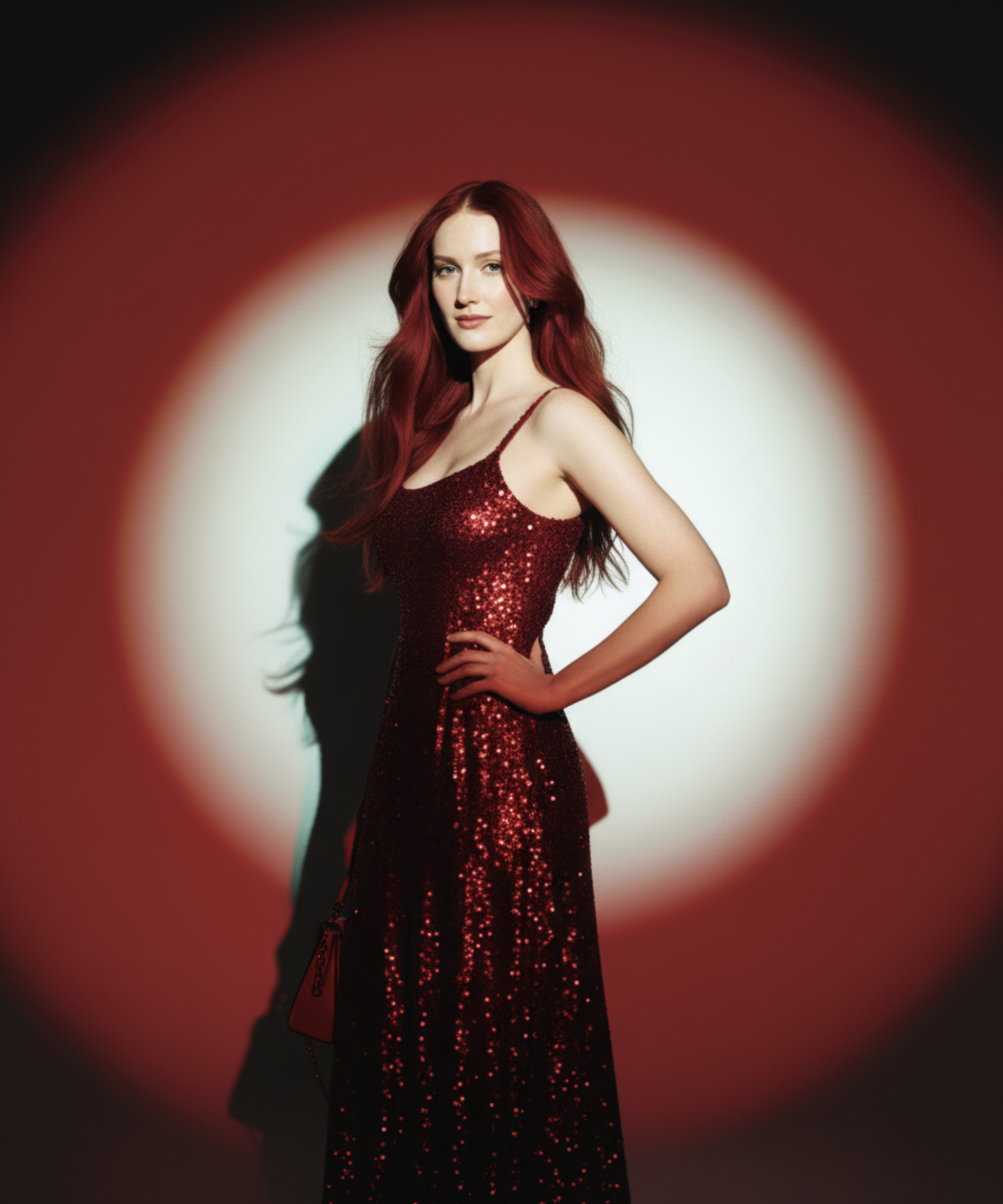 A woman in a red sequined gown poses confidently against a dramatic red and white spotlight background, showcasing elegance and style.