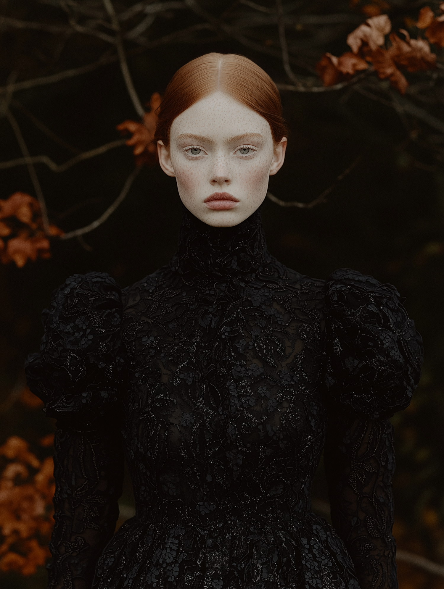 Elegant woman with red hair in a black lace dress, set against an autumnal background with brown leaves.
