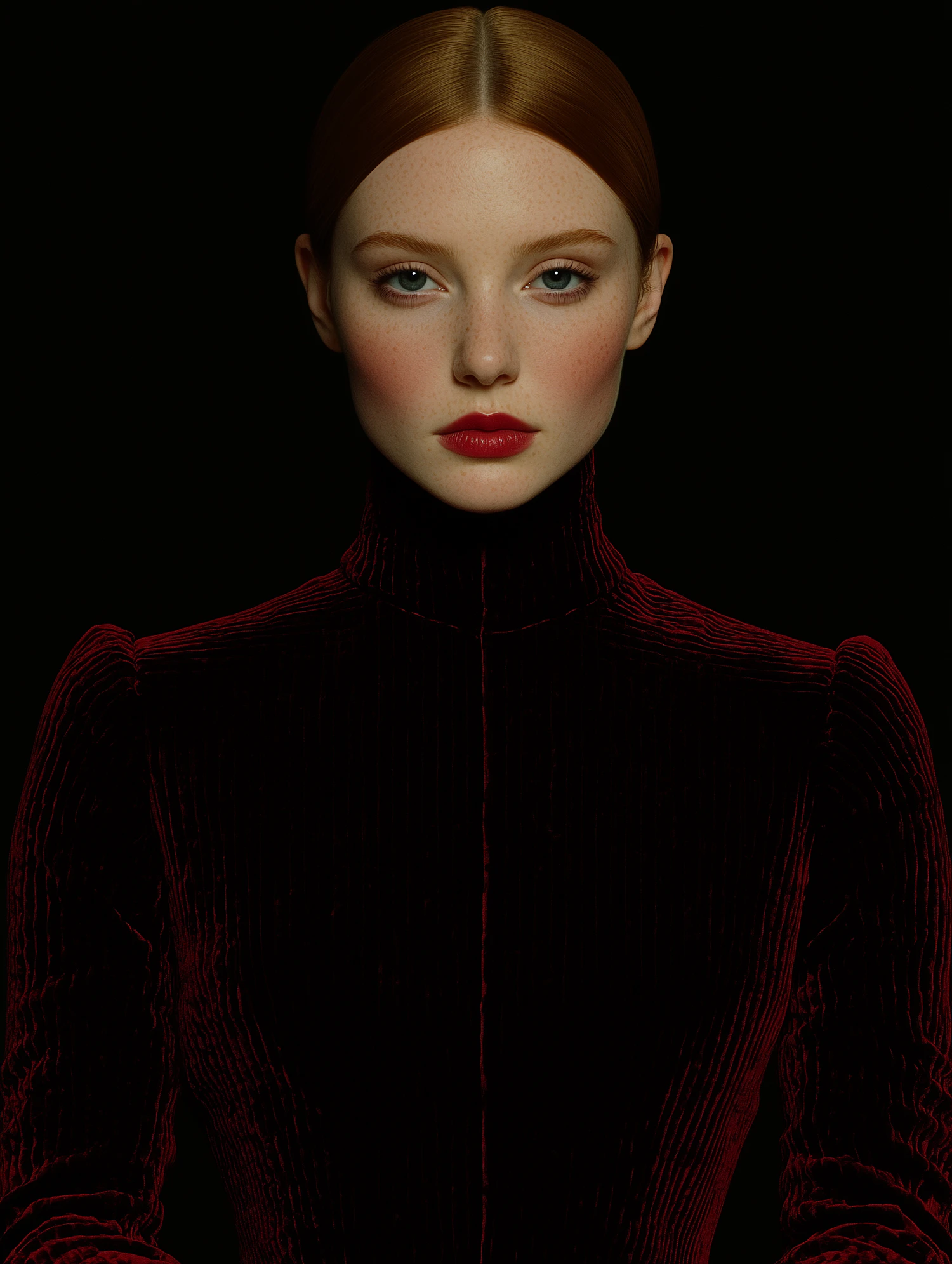 A striking portrait of a woman with red hair, green eyes, and bold red lips, set against a dark background for a dramatic effect.