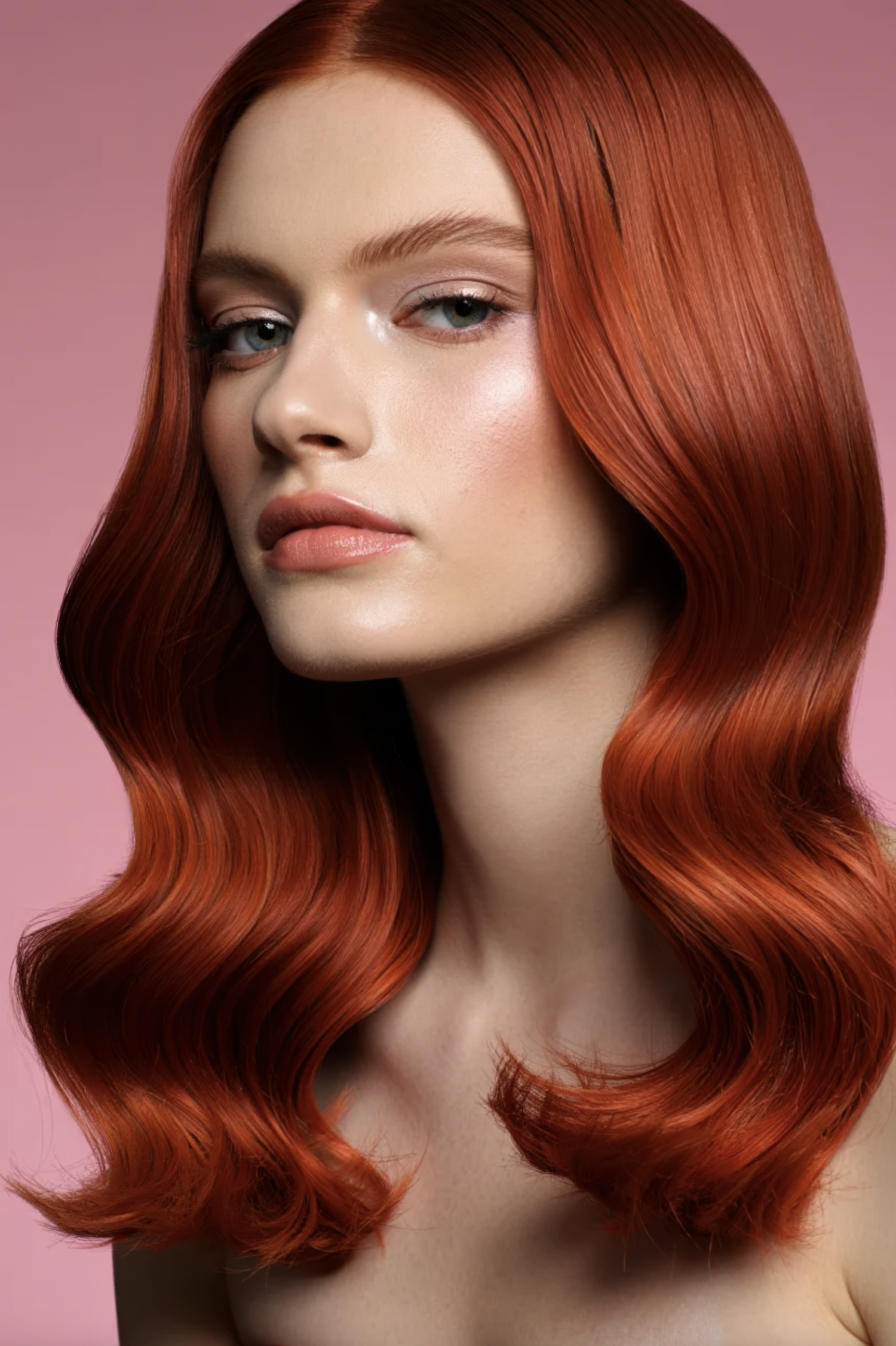 Close-up of a woman with vibrant red hair and natural makeup against a pink background, showcasing soft waves and glowing skin.