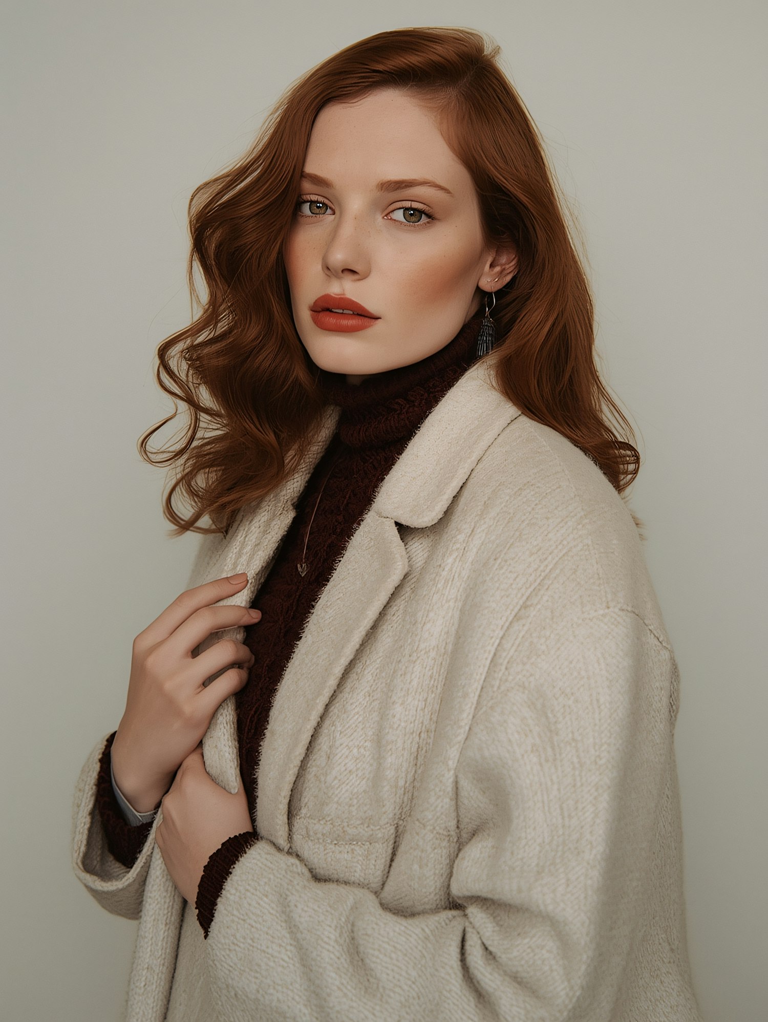 Portrait of a woman with red hair in a cream coat and maroon sweater, gazing calmly at the camera against a neutral background.