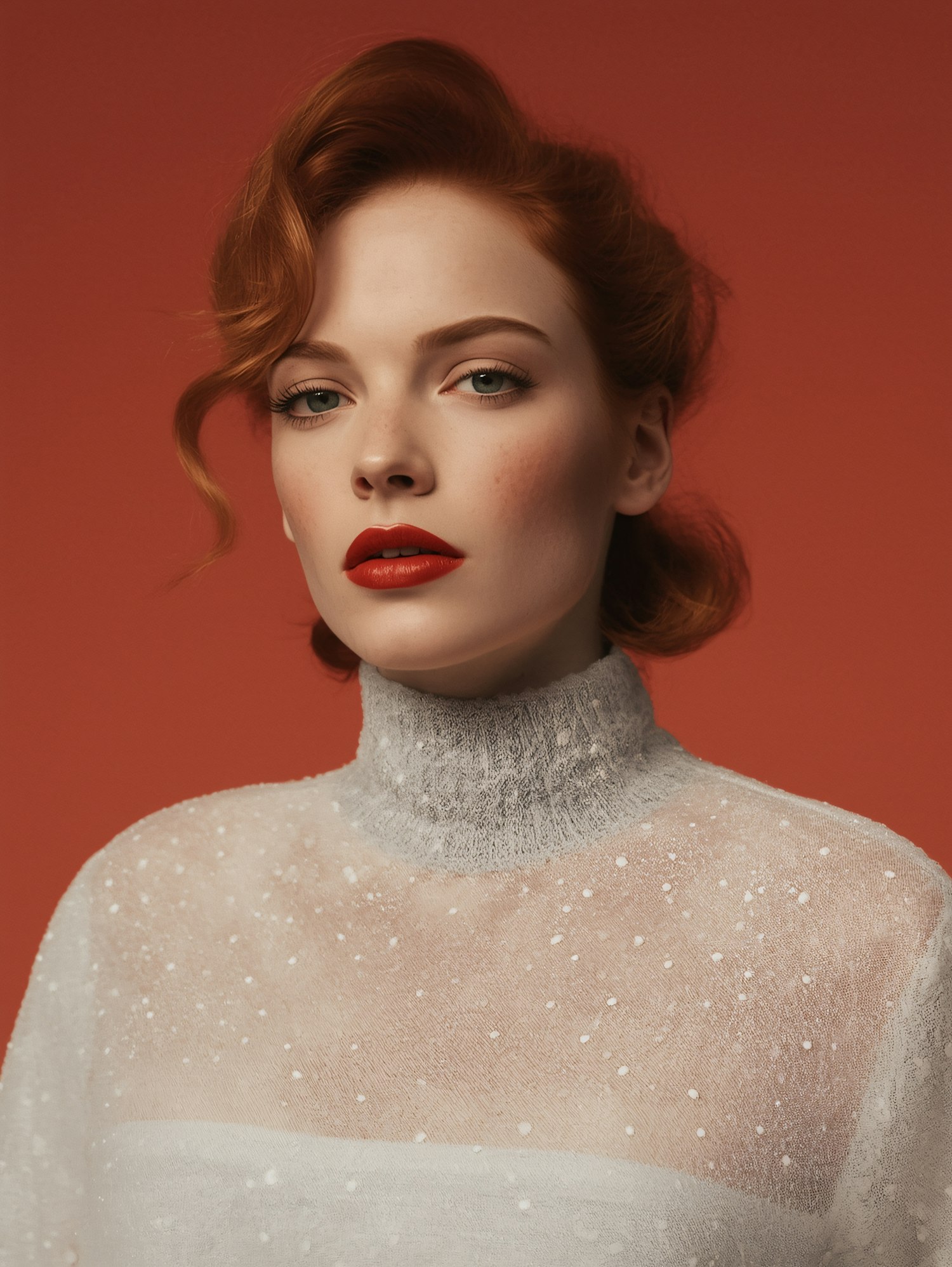 Elegant portrait of a red-haired woman in a sheer white top, set against a warm orange background, with bold red lipstick and soft lighting.
