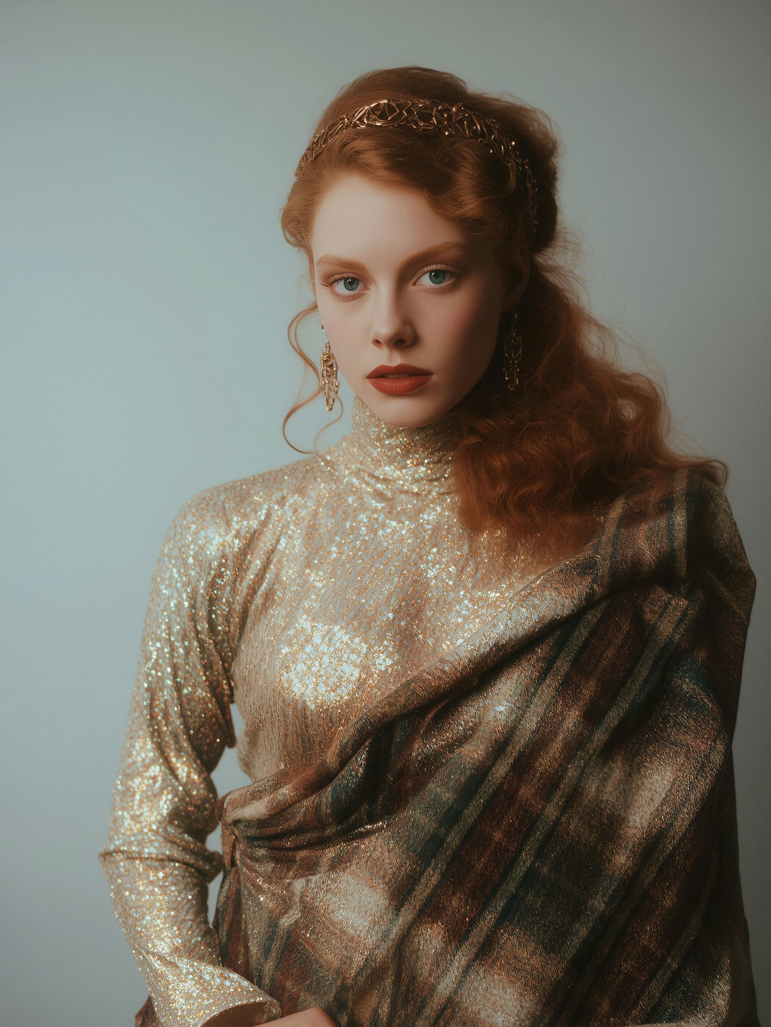 A woman with red hair and a gold headband wears a shimmering gold top and patterned shawl, exuding elegance in a softly lit setting.