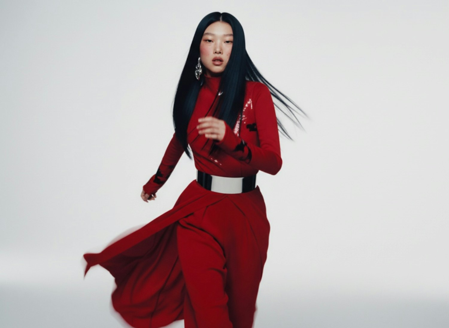 A woman in a flowing red outfit with a metallic belt, captured mid-motion against a white background, exuding energy and elegance.