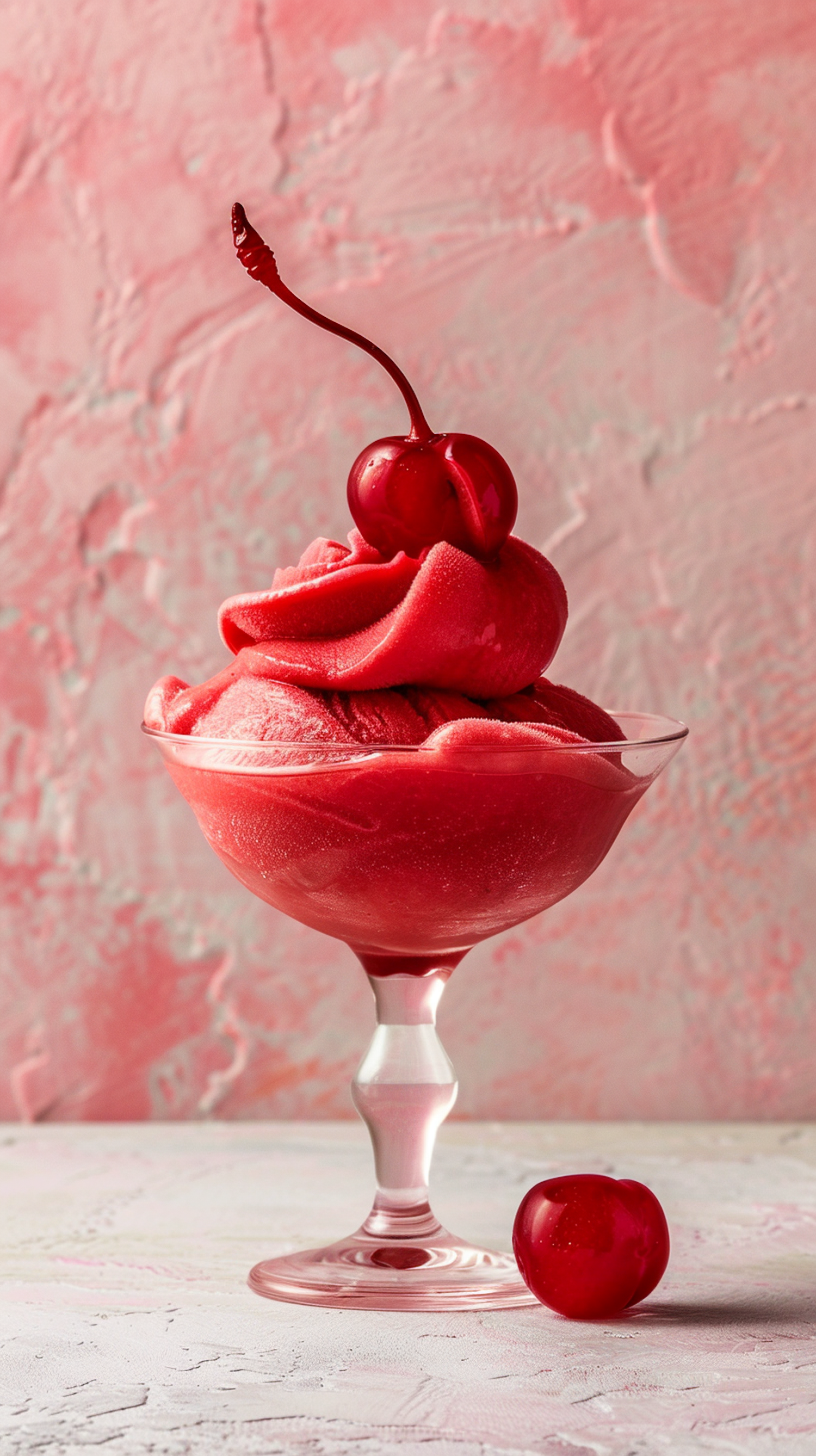 Elegant red sorbet in a glass cup with a cherry on top, set against a textured pink background.