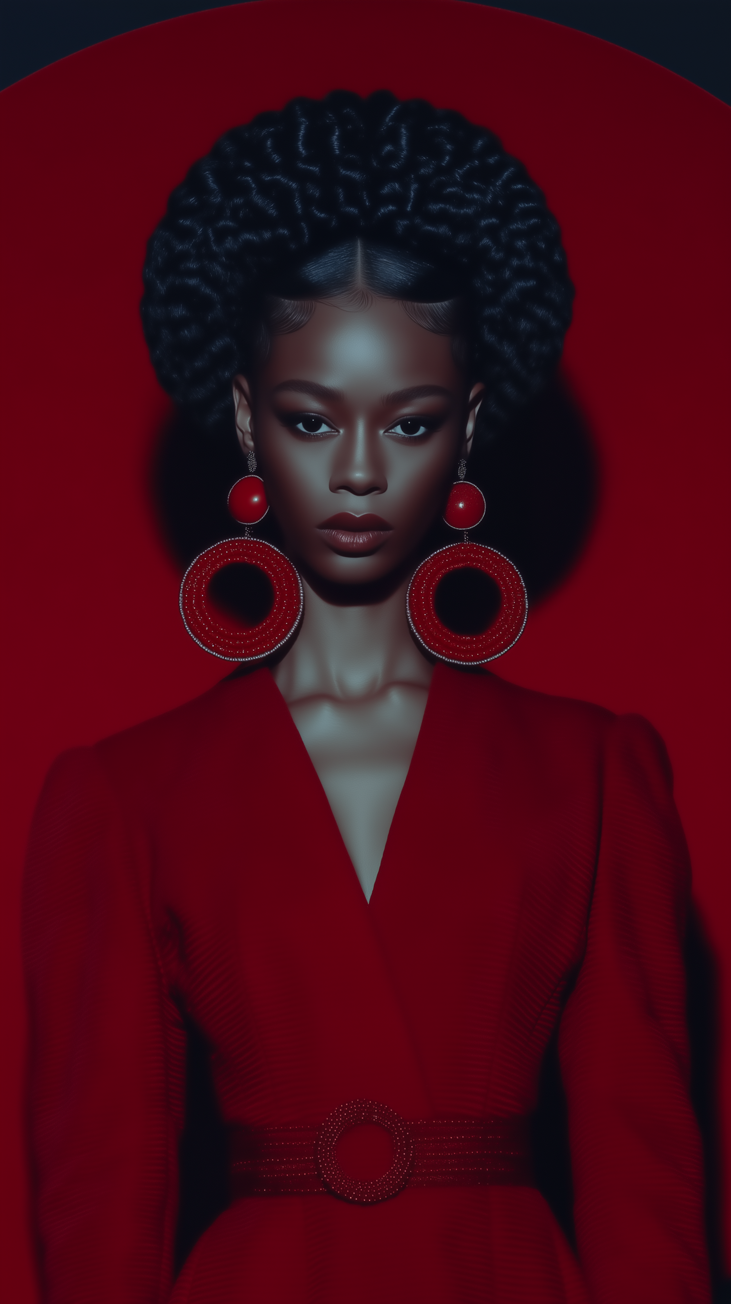A stunning portrait of a woman in a red outfit with bold earrings, set against a matching red background, exuding elegance and style.