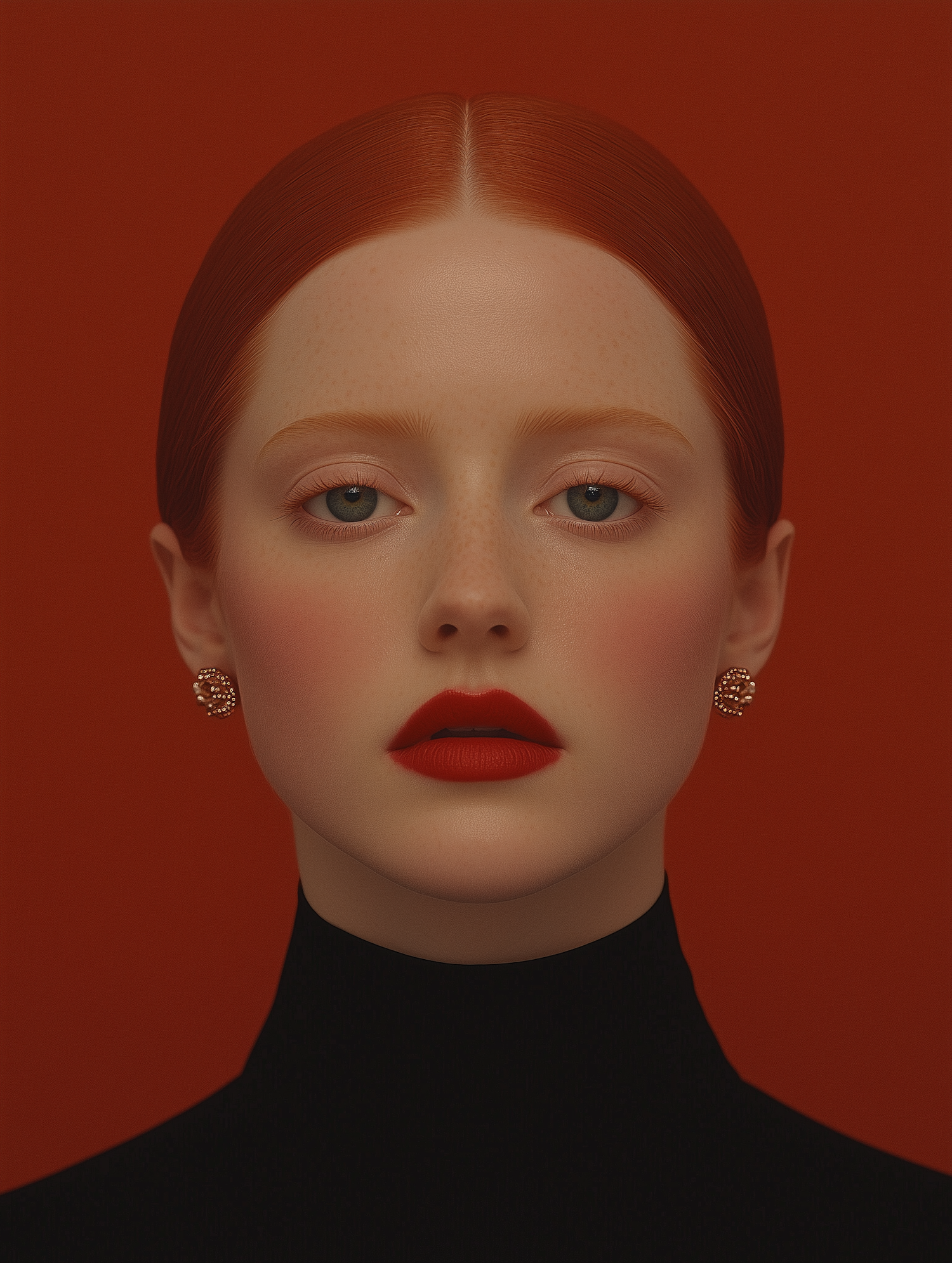 A striking portrait of a woman with red hair, bold red lipstick, and pearl earrings against a vibrant red background.