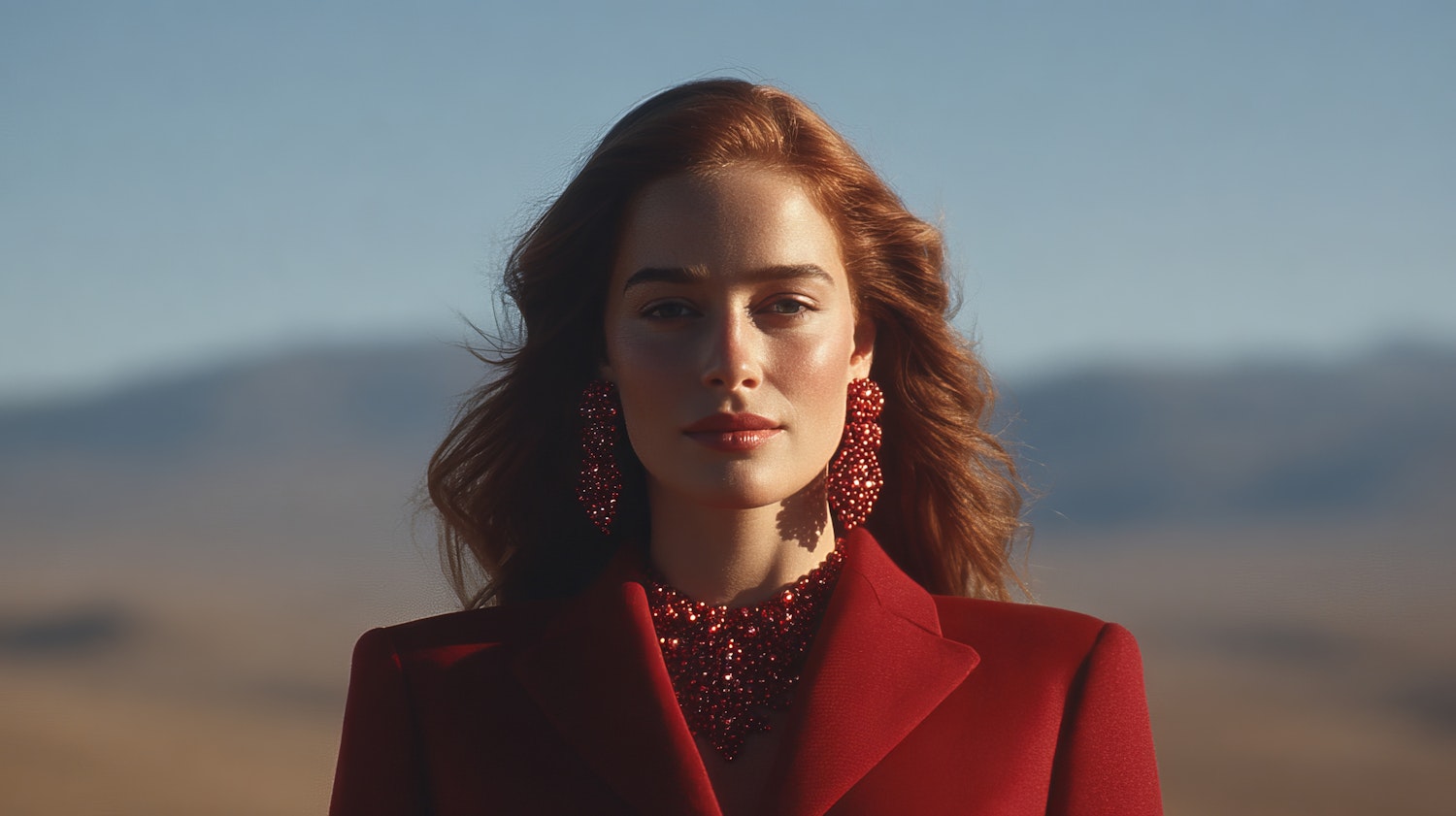 A woman with red hair and a red outfit poses outdoors, wearing matching red jewelry, with a serene and confident expression.