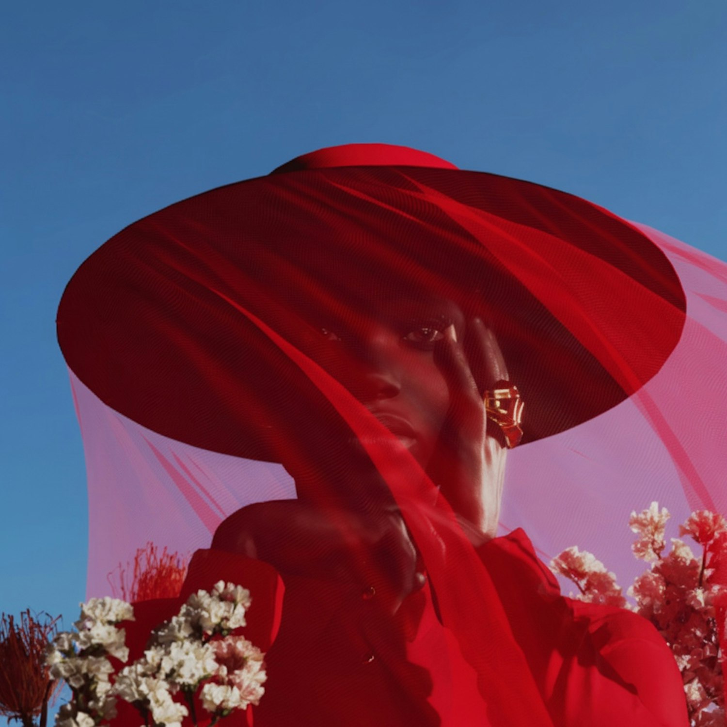 A person in a red hat and veil poses elegantly against a blue sky, with white flowers in the foreground adding contrast.