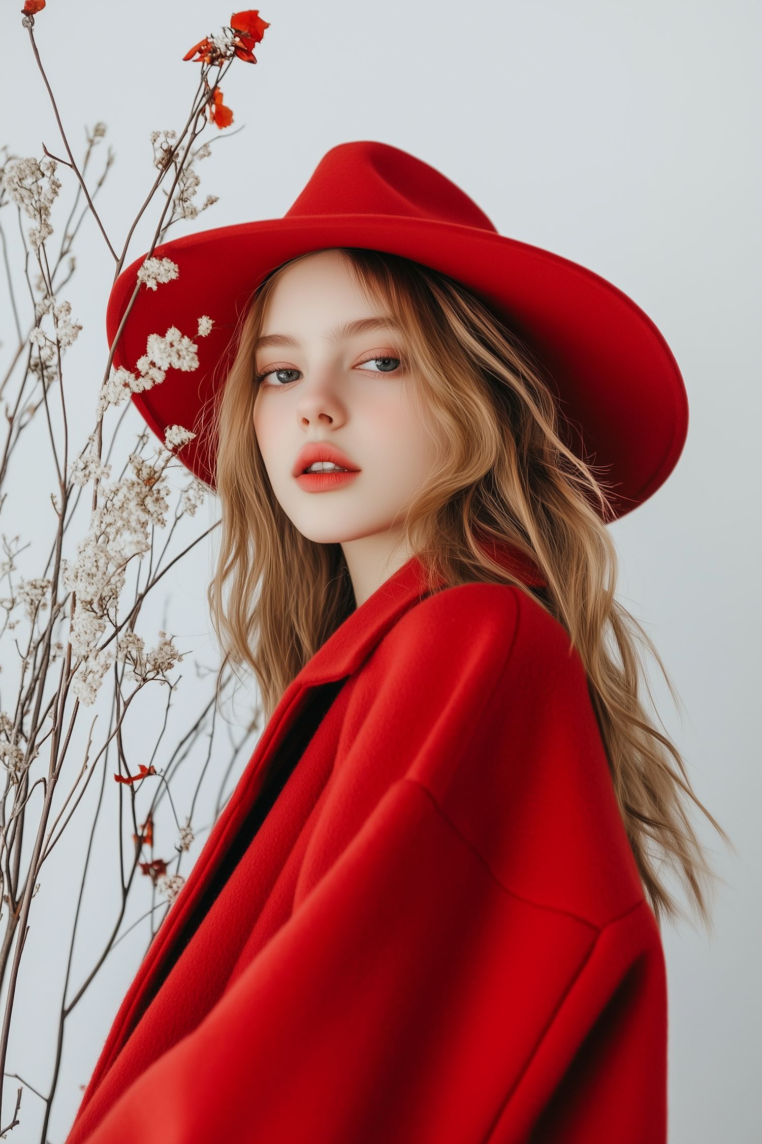 Elegant woman in a red hat and coat poses with delicate white flowers, blending bold fashion with natural elements.