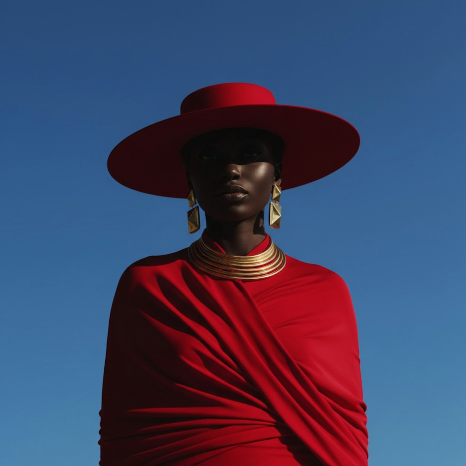A person in a red outfit and hat with gold accessories stands against a clear blue sky, creating a bold and elegant visual contrast.