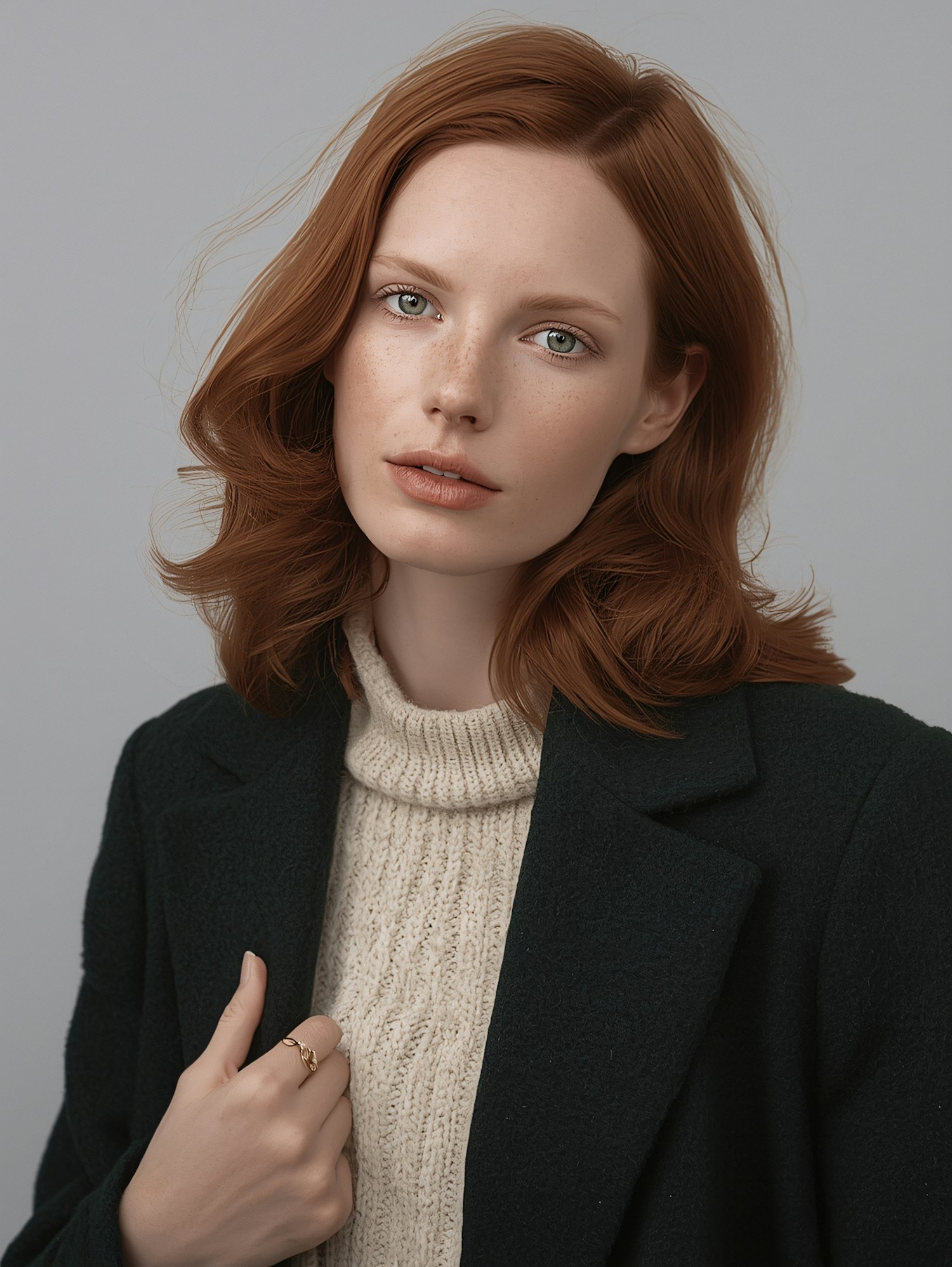 Portrait of a red-haired woman in a knit sweater and coat, showcasing a serene expression and elegant style against a neutral background.