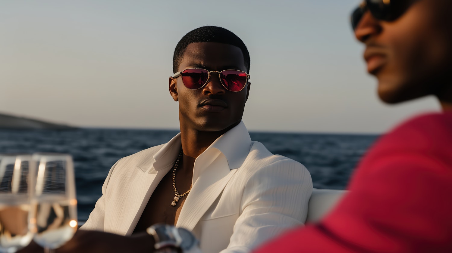 Stylish man in white suit with red sunglasses on a yacht, ocean backdrop, and wine glasses, exuding luxury and sophistication.