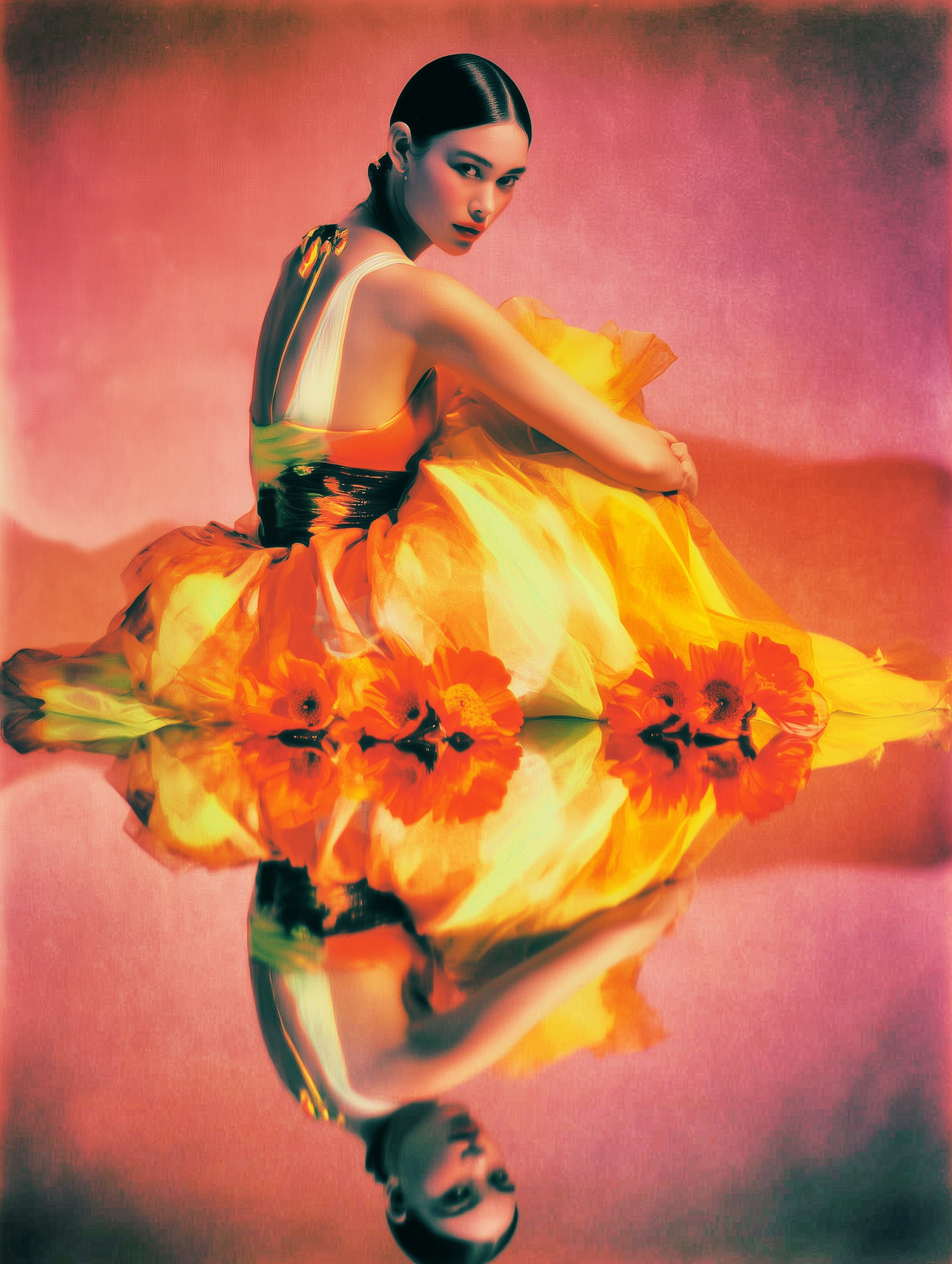 A woman in a vibrant yellow-orange dress with floral accents sits gracefully against a warm-toned background, her reflection mirrored below.