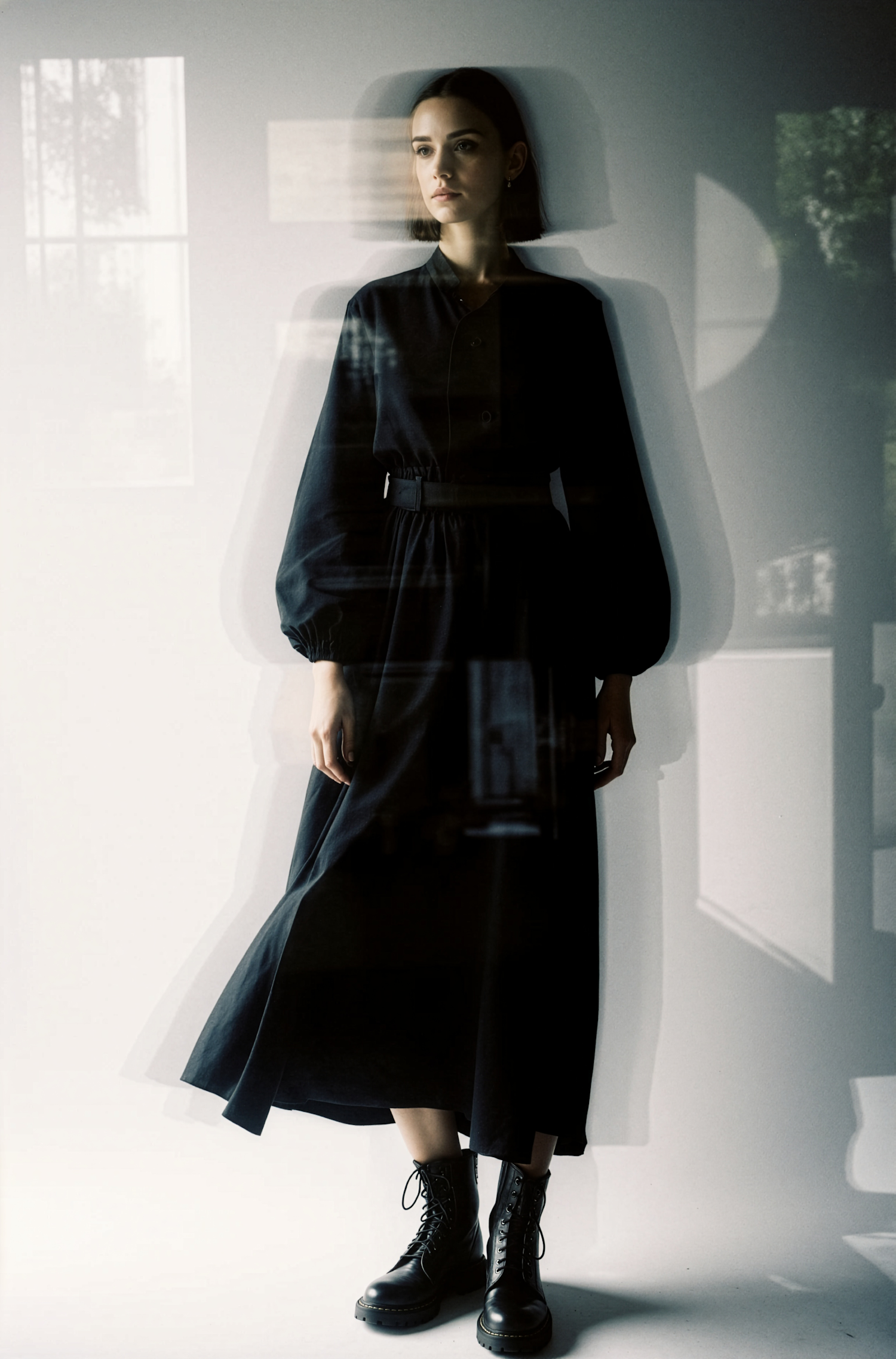A woman in a black dress and boots stands in a softly lit room, with window reflections creating a dreamy, layered effect.