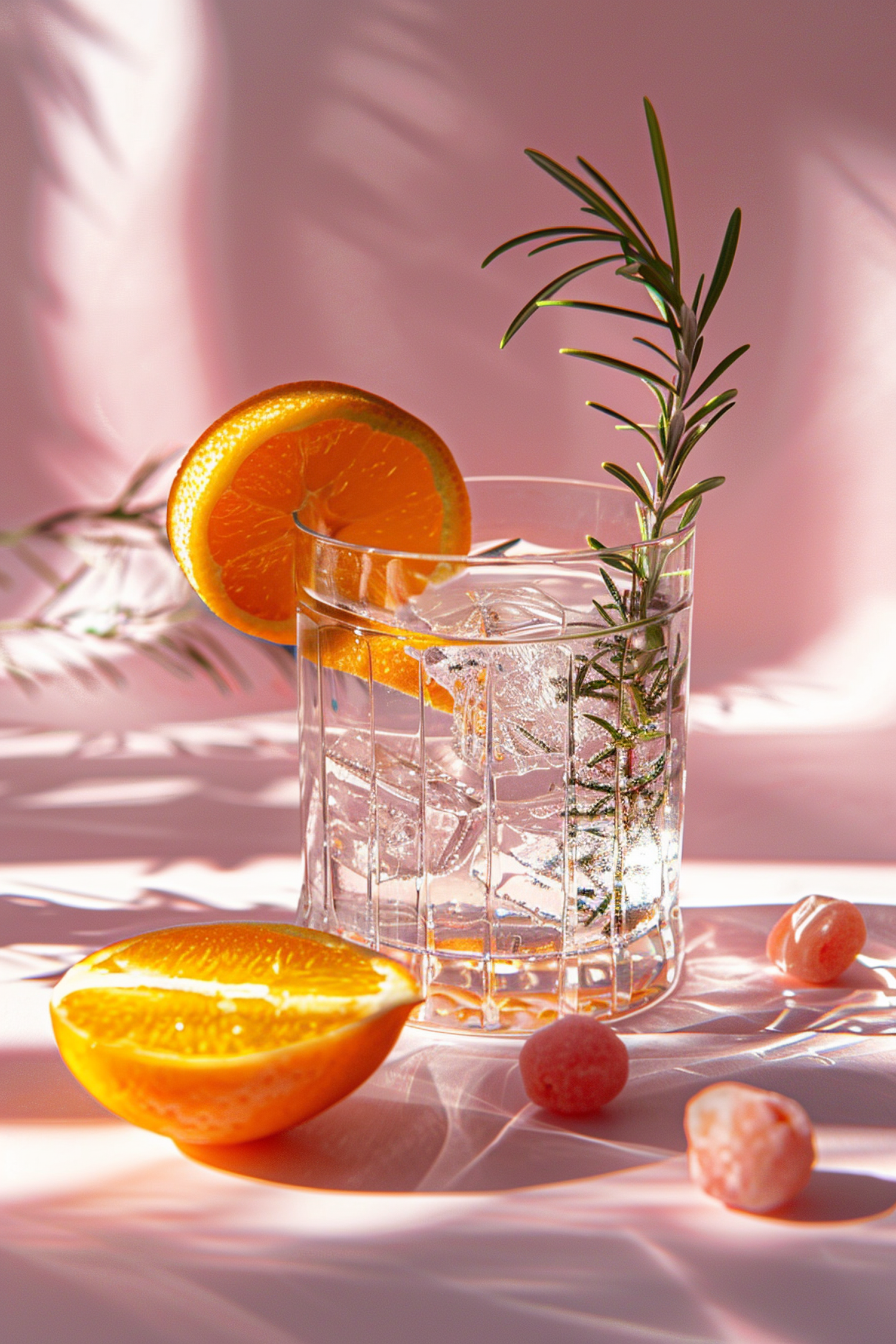 Refreshing drink with ice, rosemary, and orange slice in a textured glass on a pink background, surrounded by candies and orange slices.