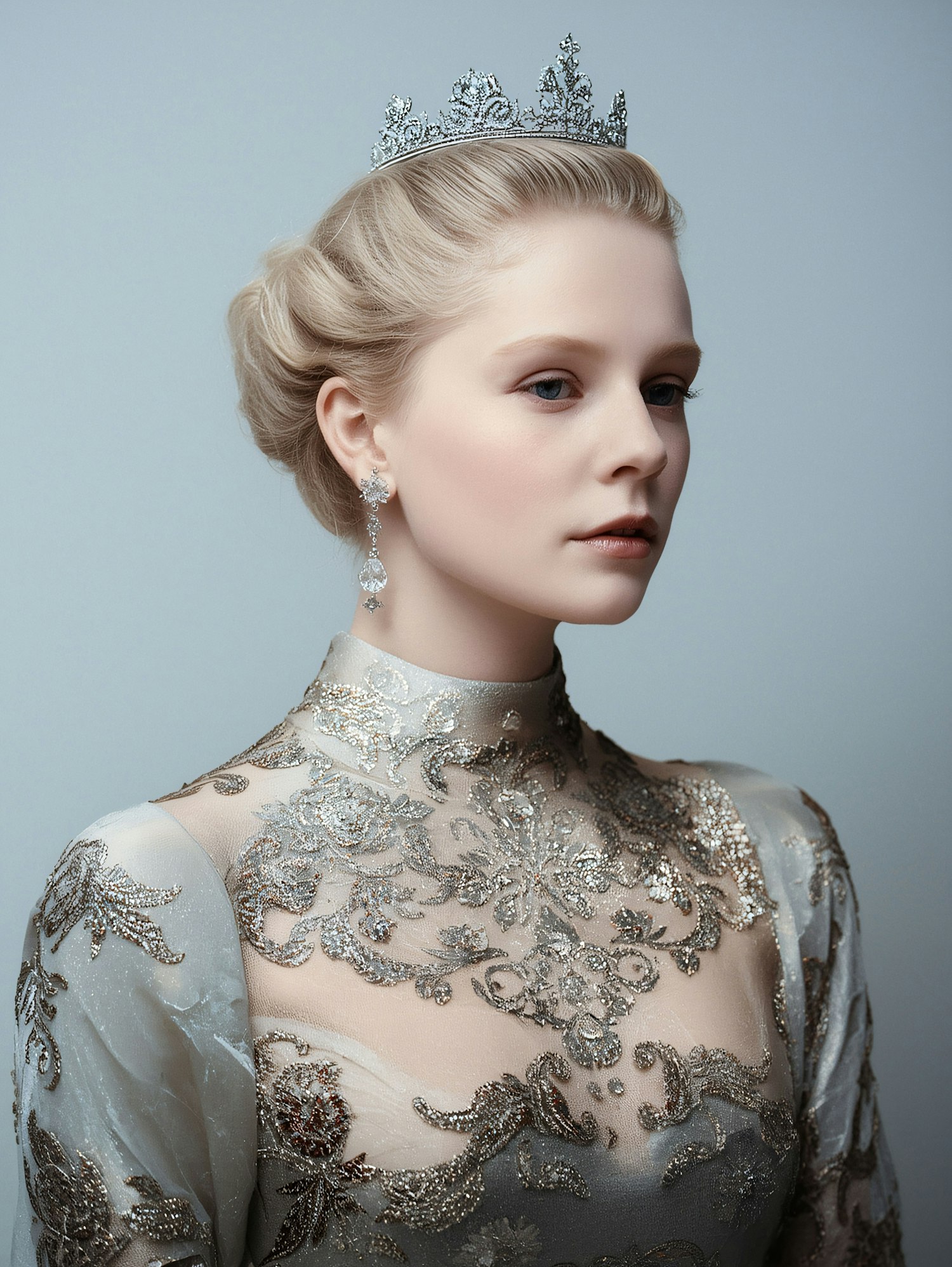 A regal woman in a silver embroidered gown and tiara, exuding elegance with her poised demeanor and intricate accessories.