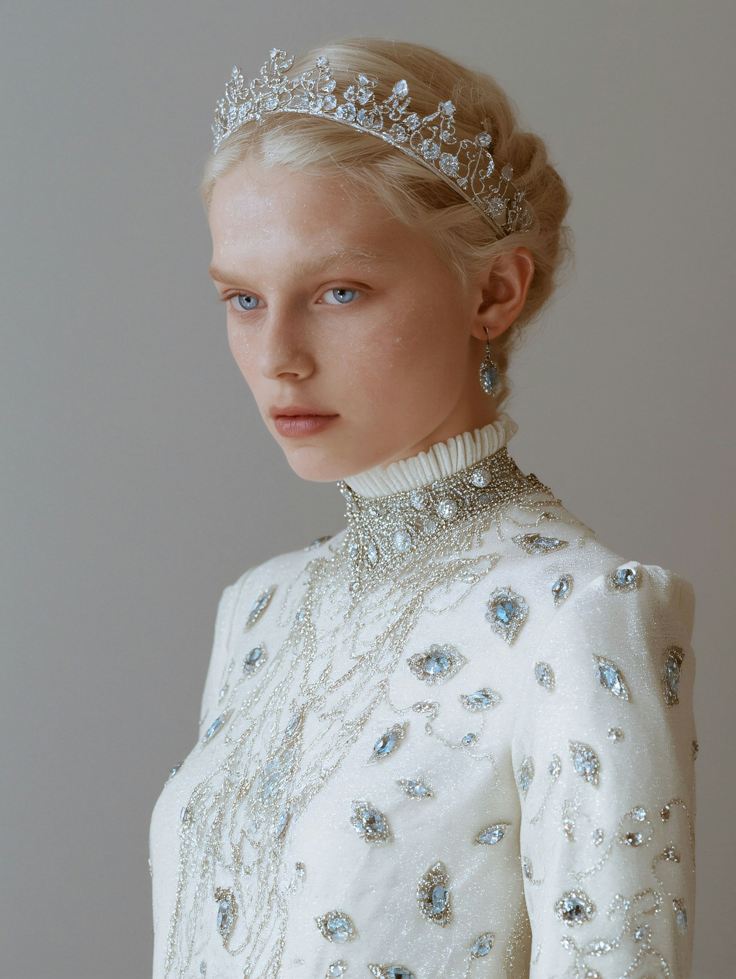A regal portrait of a woman in a gemstone-adorned white gown and silver tiara, exuding elegance and sophistication.