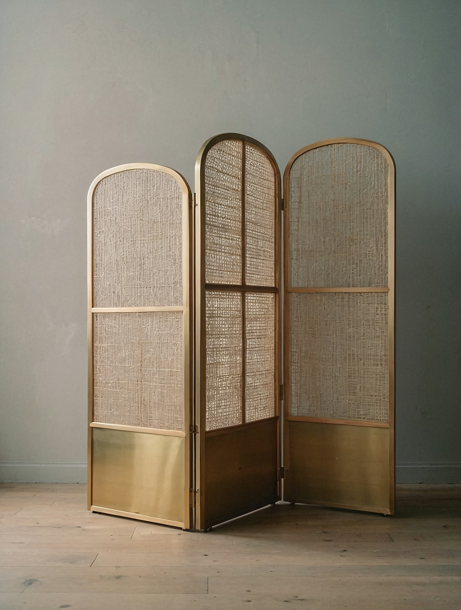 Elegant three-panel room divider with golden metal frame, woven rattan details, and smooth metallic accents, perfect for modern interiors.