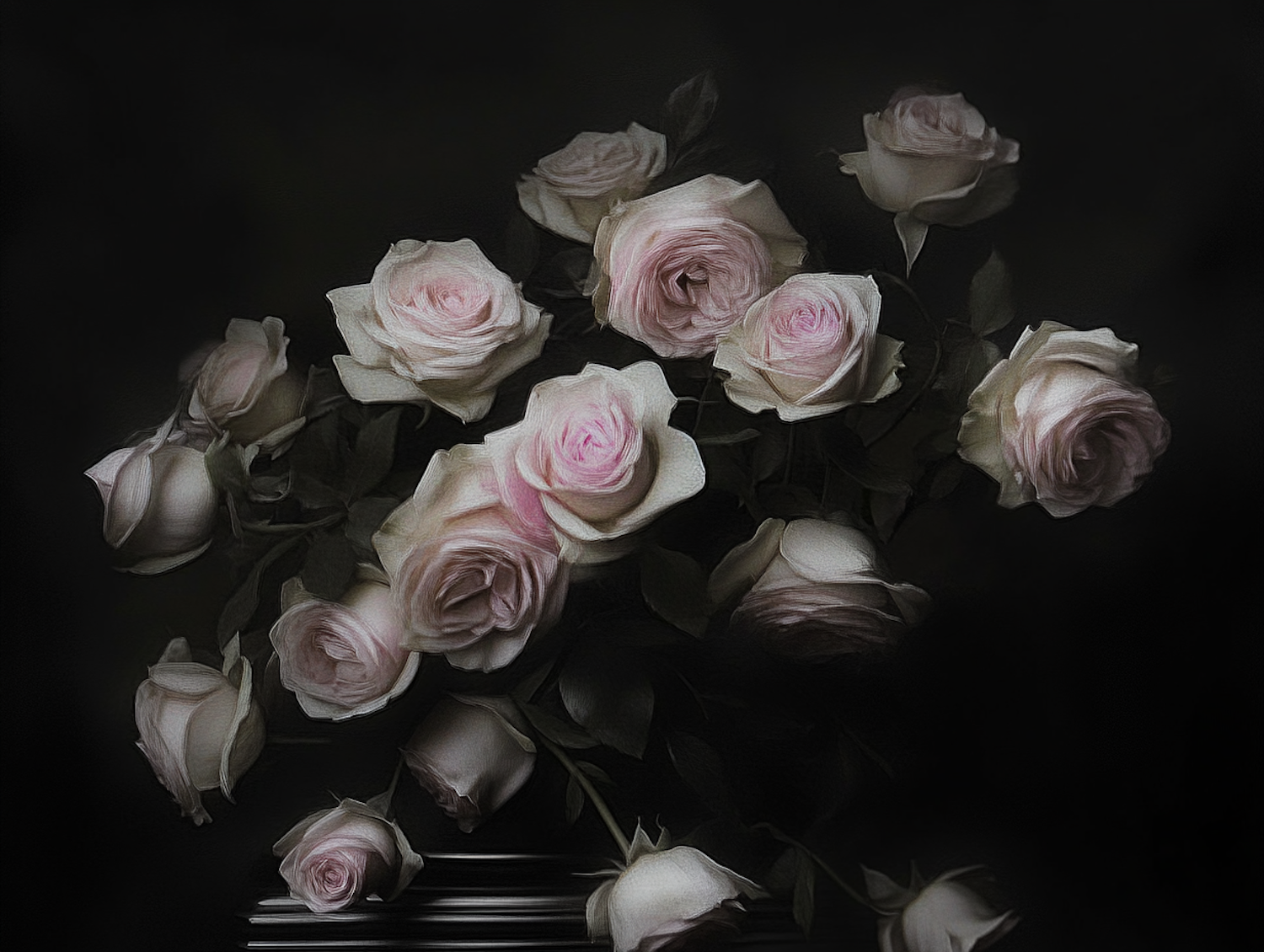 A stunning bouquet of pale pink and white roses in full bloom, set against a dark, moody background for a timeless, romantic vibe.