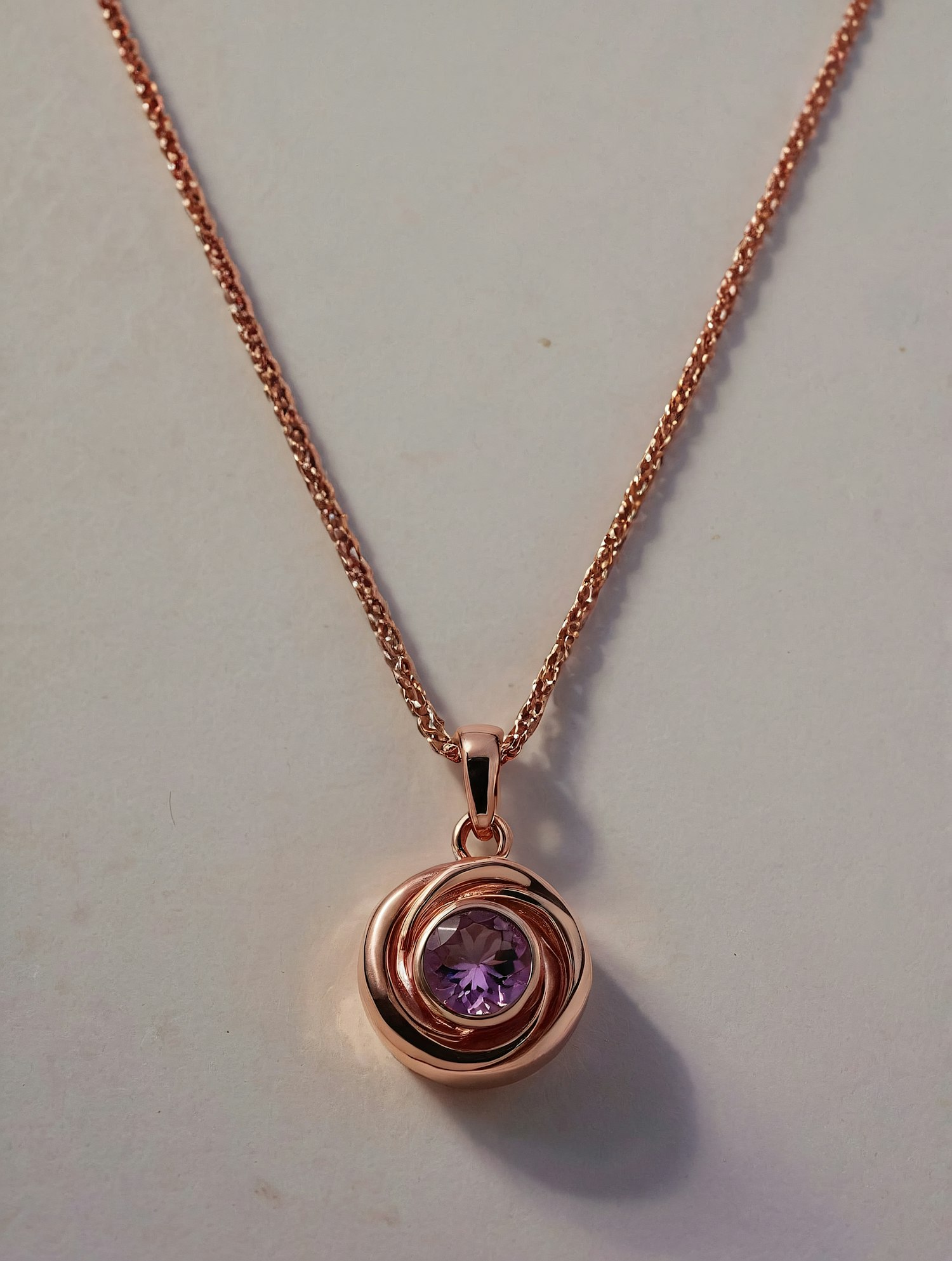 Elegant rose gold necklace with a purple gemstone pendant on a fine chain, perfect for adding a touch of luxury to any outfit.