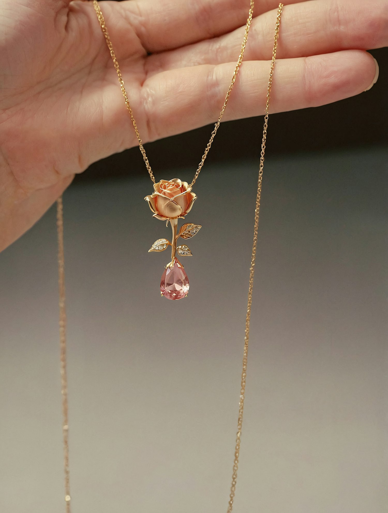 Elegant gold necklace with a rose pendant and pink teardrop gemstone, held against a soft background for a refined look.