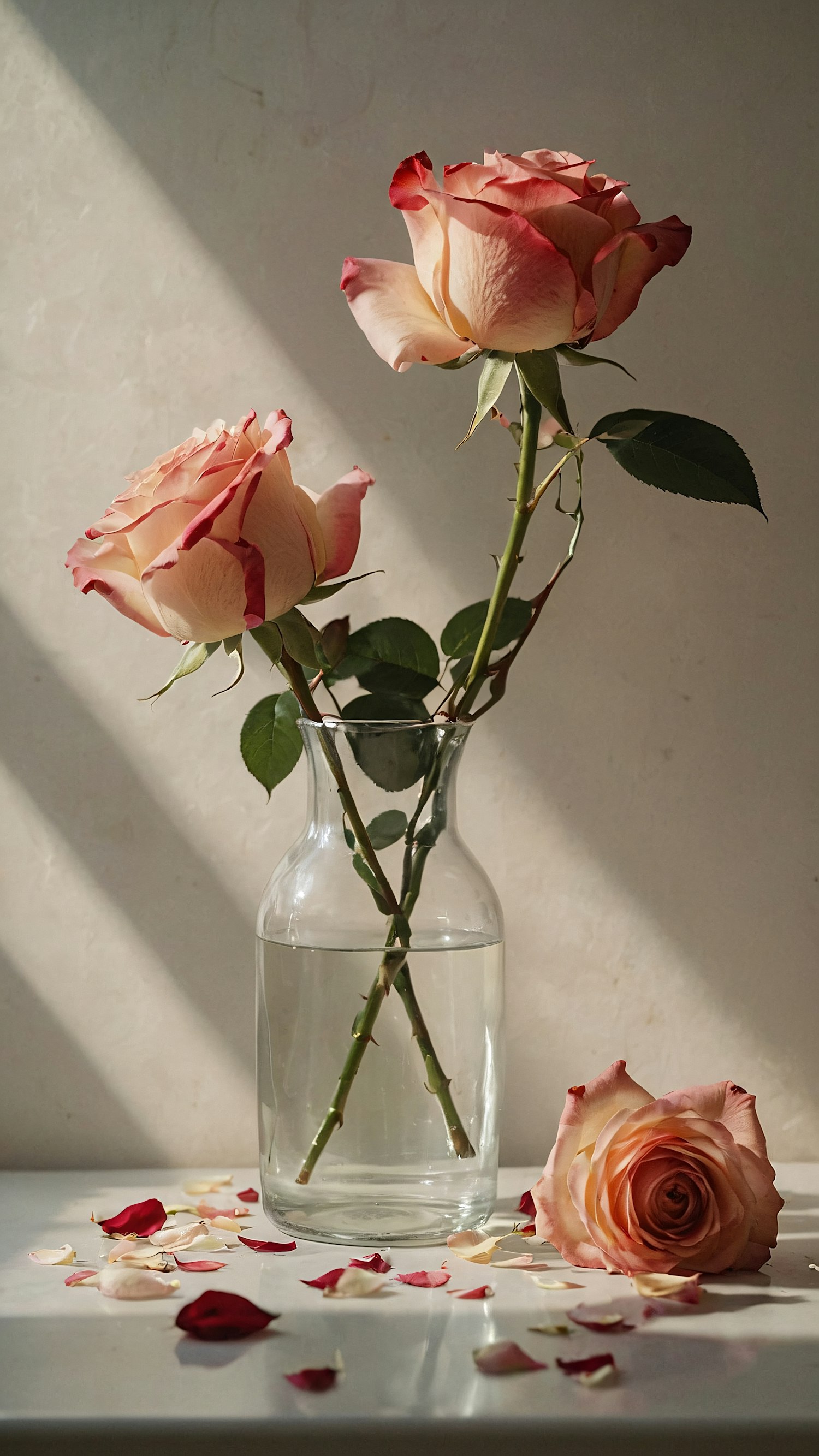 Elegant pink roses in a glass vase with scattered petals, bathed in soft sunlight, creating a serene and romantic atmosphere.
