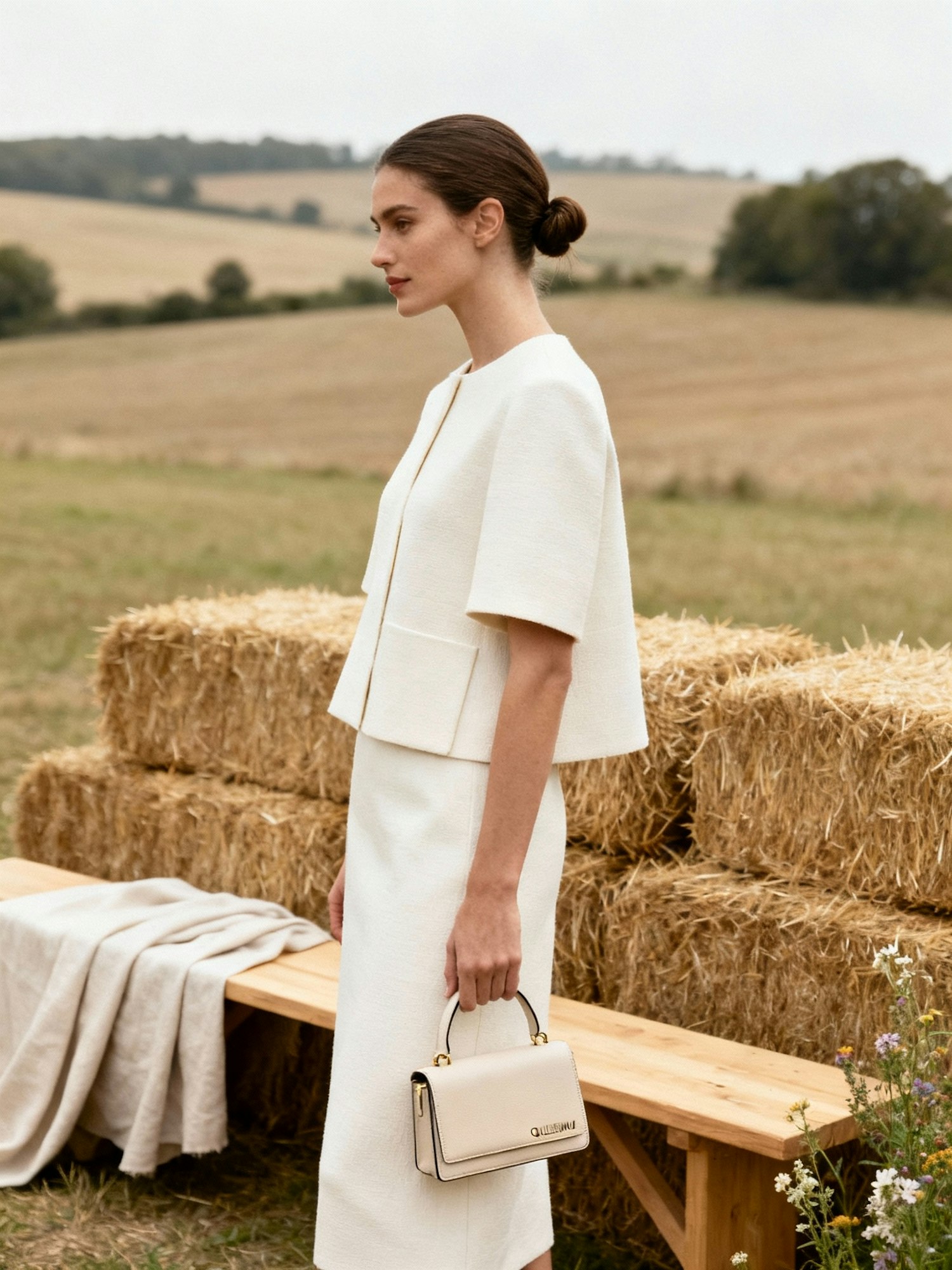 A woman in a white outfit stands by hay bales in a rural field, holding a handbag, with a serene and elegant atmosphere.