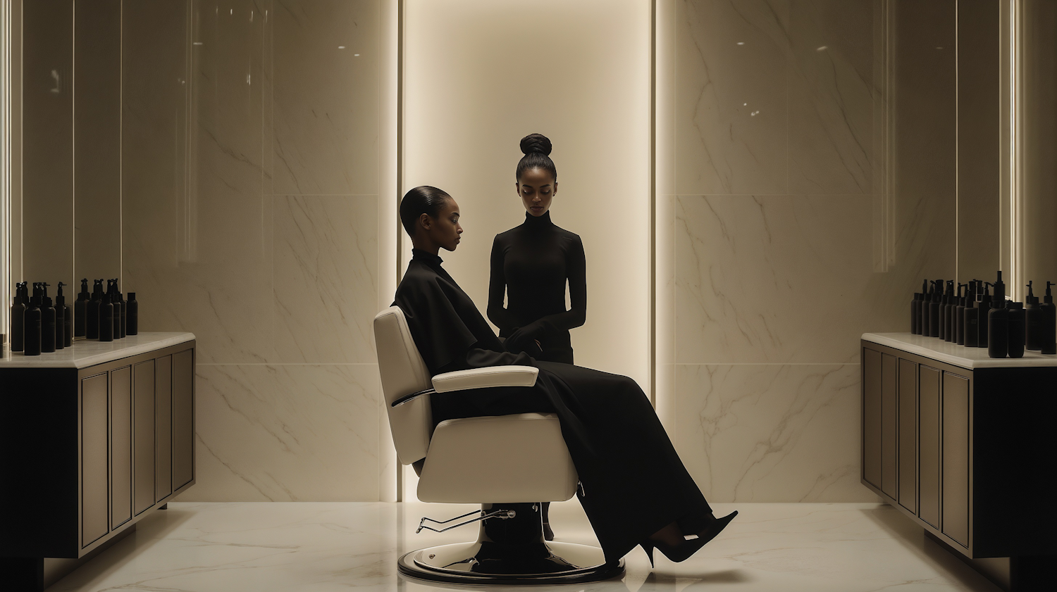 Elegant salon scene with two women, one seated and one standing, in a minimalist setting with marble walls and sleek black attire.