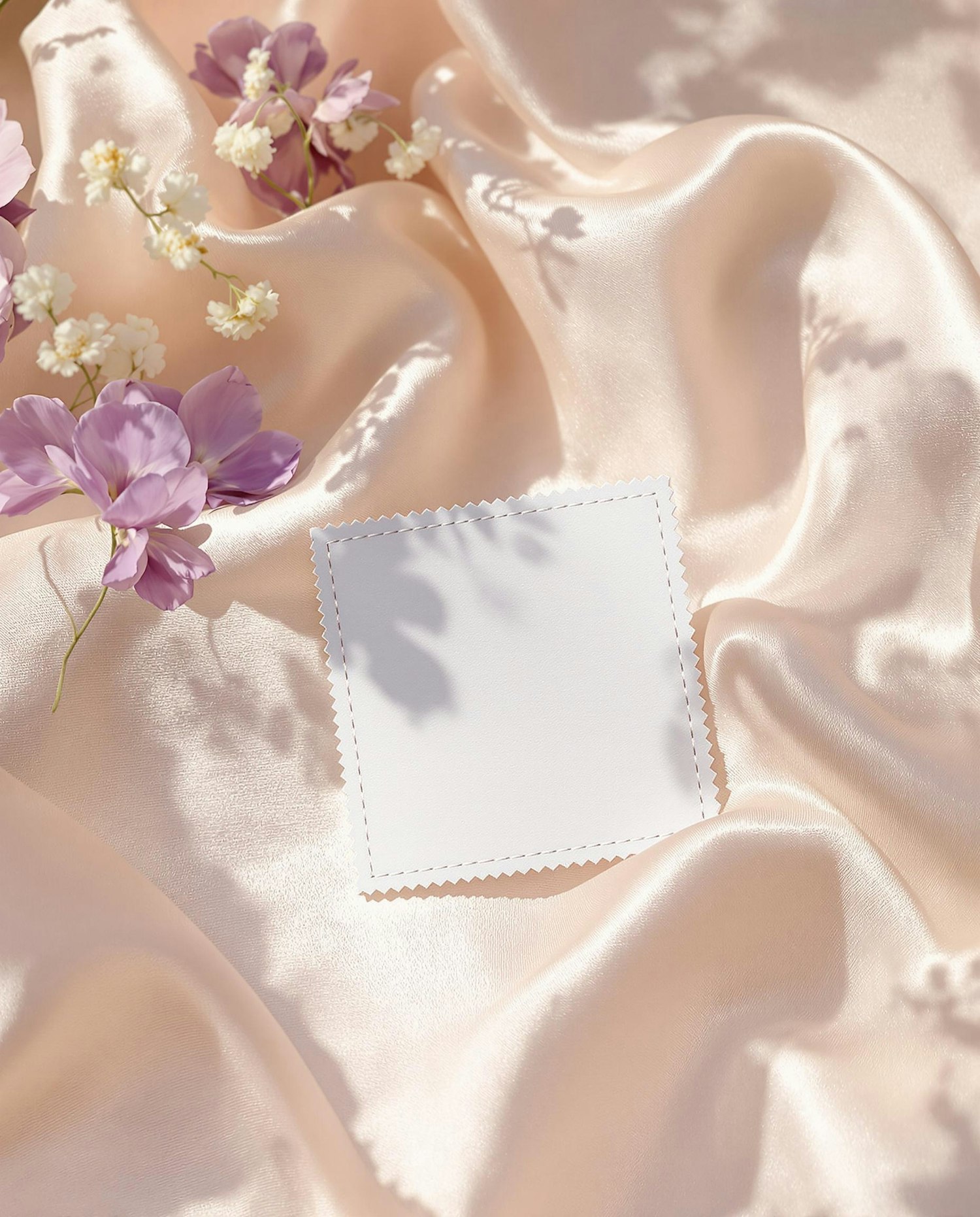 Soft pink satin with delicate flowers and a blank scalloped card, perfect for elegant invitations or romantic designs.