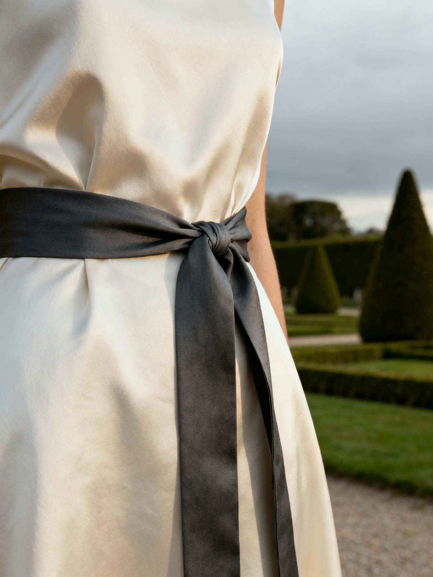 Editorial photoshoot for the brand CELINE, architectural minimalism, quiet and refined elegance. French formal garden with geometric topiaries, marble statues, stone stairs and trimmed grass. Late afternoon, overcast sky, soft and natural lighting only. Neutral tones overall (beige, white, black, grey), no text, no logo, perfectly realistic photo rendering. — A detailed shot of a woman’s waist wearing an ivory dress with a dark slate ribbon tied loosely in a knot. The texture of the fabric is matte silk, soft creases visible around the knot. Natural light accentuates folds and depth. The focus is sharp on the knot, the background of trimmed greenery completely blurred. No visible face or hands.