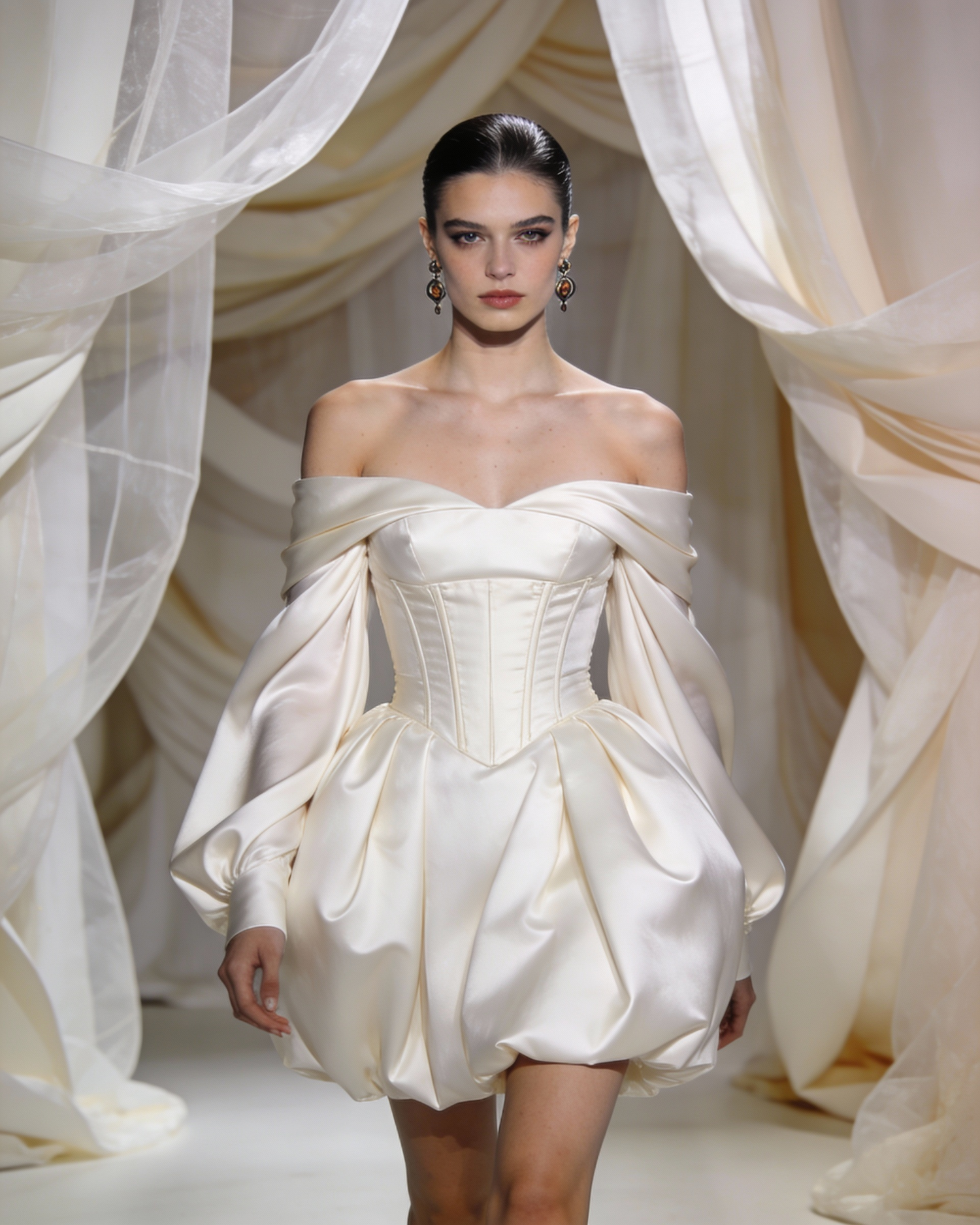 A model in a white satin off-shoulder dress with voluminous sleeves and a corset bodice, set against a backdrop of flowing sheer fabric.