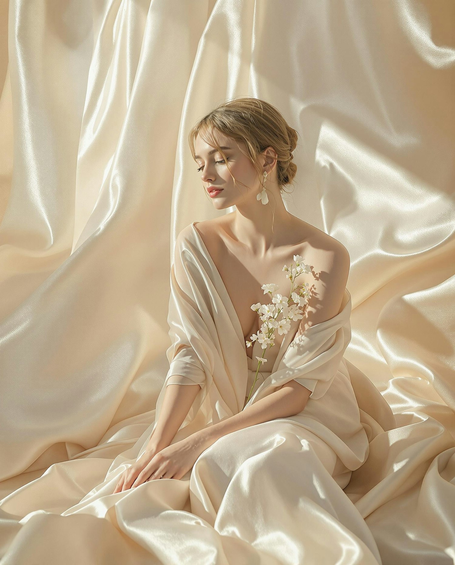 A serene portrait of a woman in cream satin, holding white flowers, surrounded by soft, luxurious fabric and gentle lighting.