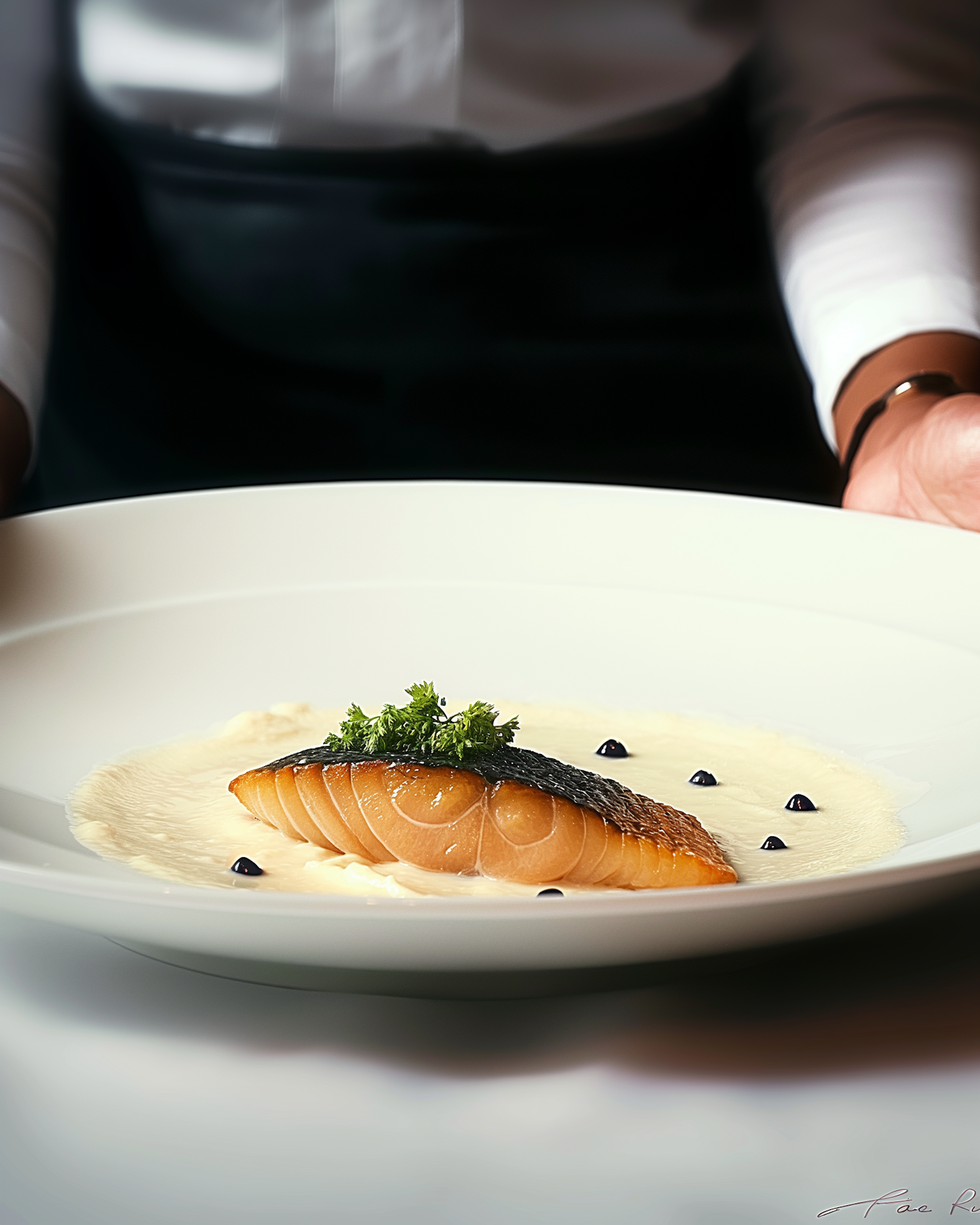 Gourmet salmon dish with creamy sauce and black dots, elegantly presented on a white plate, held by a server in a fine dining setting.