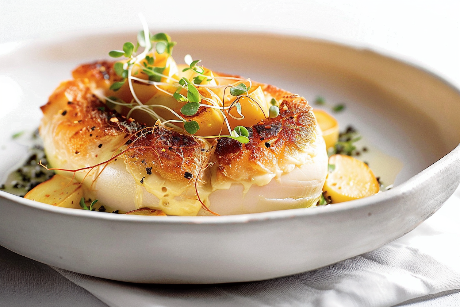 Seared scallop with microgreens and creamy sauce in an elegant white bowl, showcasing fine dining presentation.