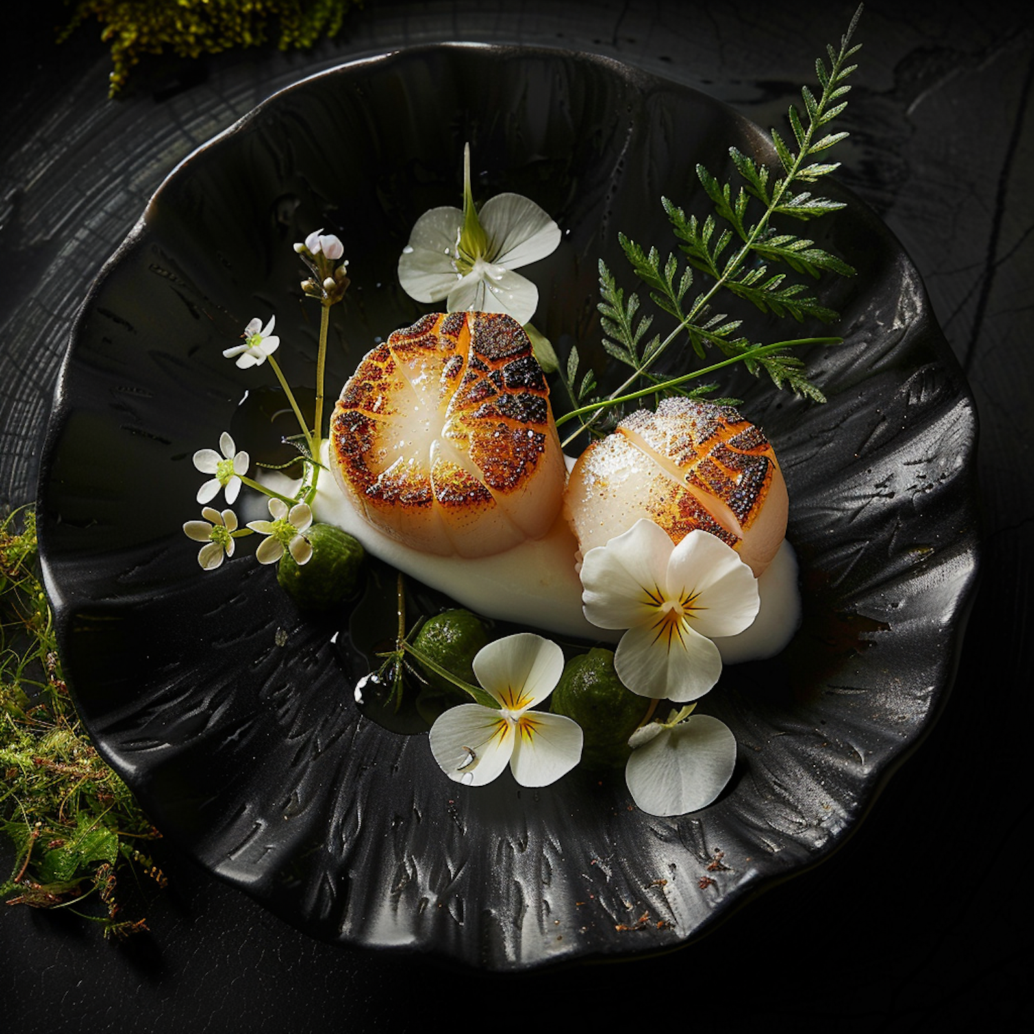 Elegant dish with seared scallops, white flowers, and green garnish on a black plate, showcasing fine dining artistry.
