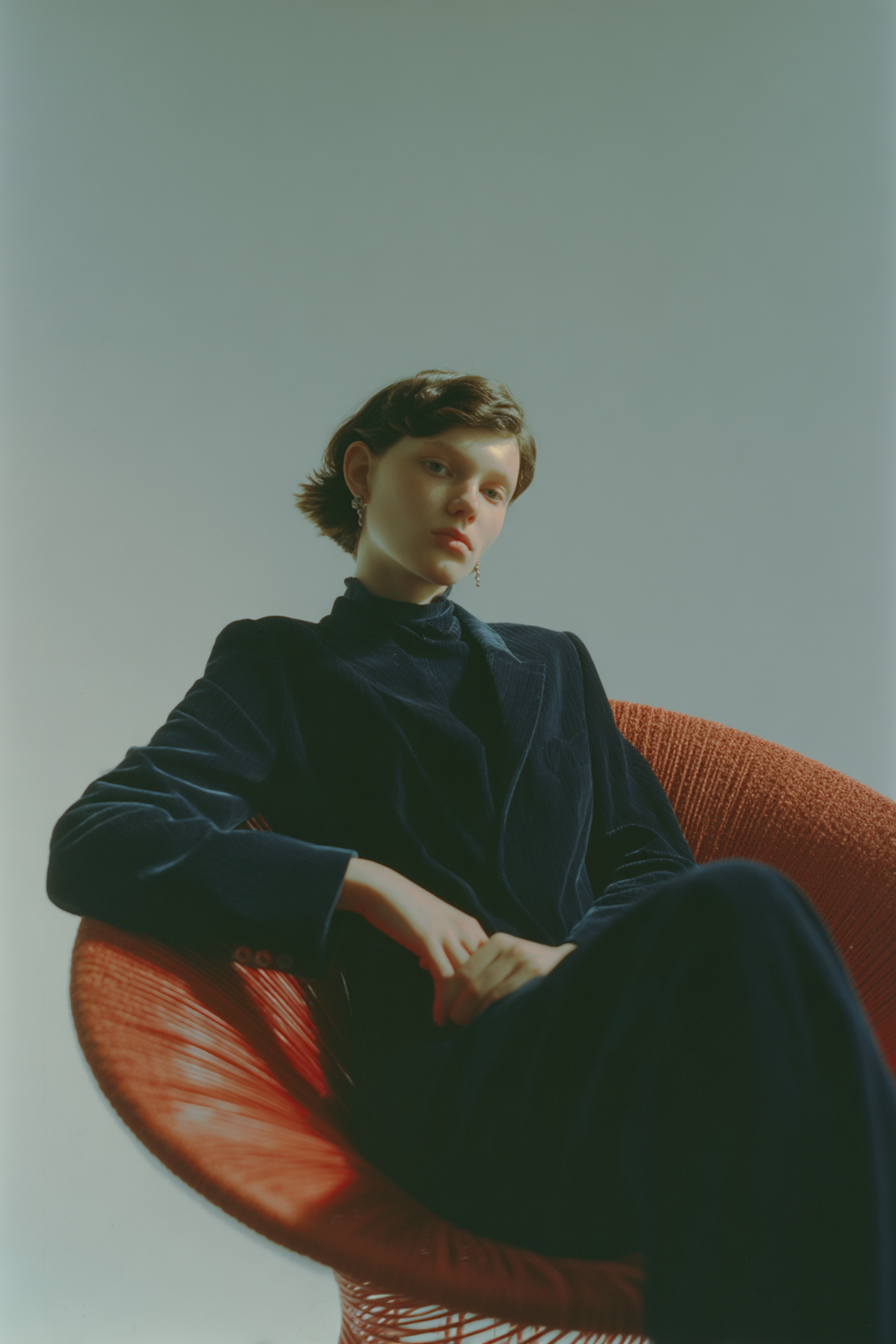 Stylish portrait featuring a person seated in a vibrantly textured red chair, wearing a sleek dark suit against a clean backdrop.