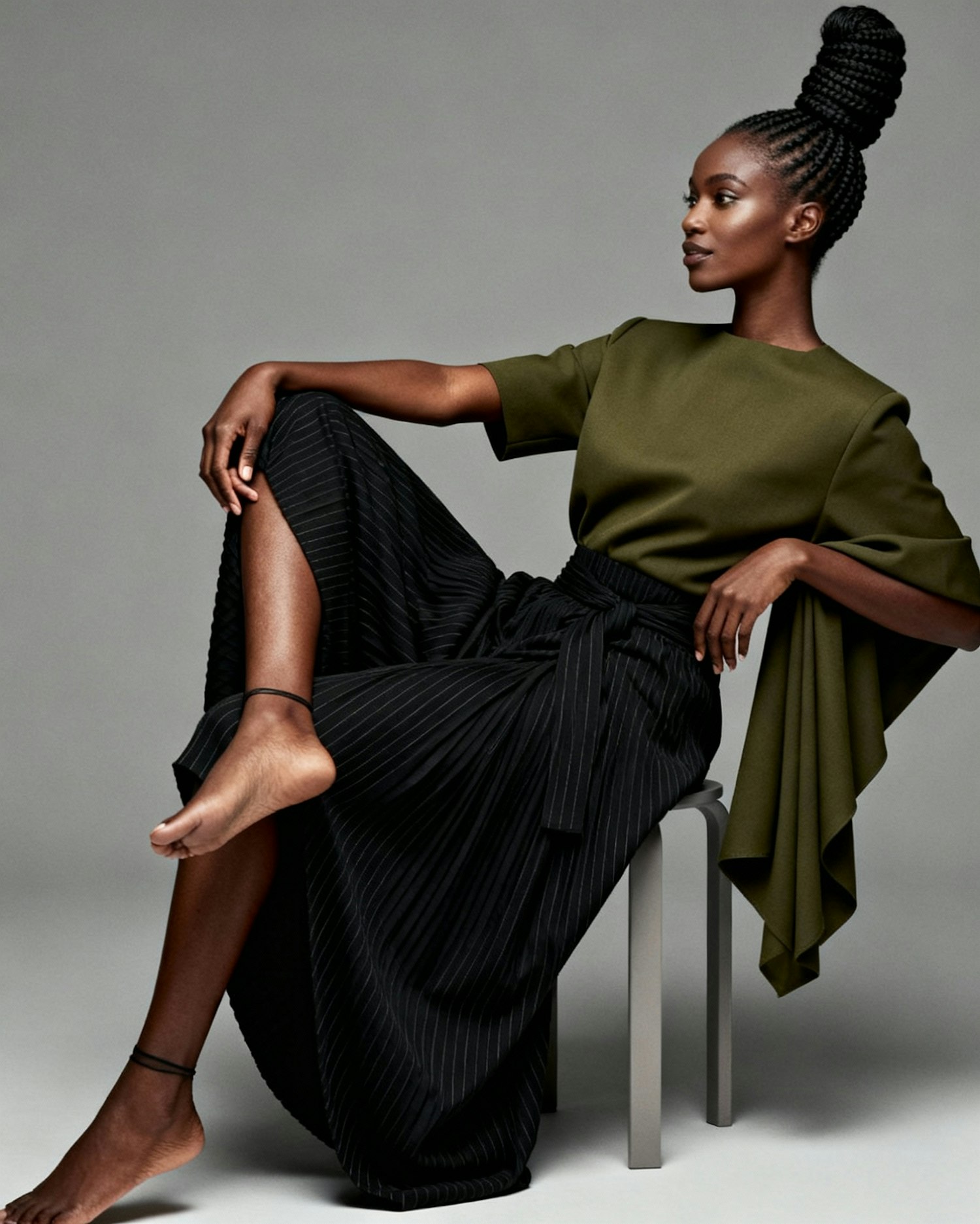 Full-body, ultra-high-definition portrait of a stylish Black woman seated gracefully against a neutral gray background. She wears a tailored olive green top paired with wide-legged kaftan-style pants in black pinstripes. Her legs are crossed at the ankle, one hand resting lightly on her knee, the other draped casually over the back of a minimalist stool. Her hair is styled in a sleek braided updo, adding sculptural elegance to her modern silhouette. Lighting is soft and directional, casting sculptural highlights across her skin and garment. The neutral gray background enhances the muted green tones of her outfit and the flowing structure of the kaftan pants, making the layered textures stand out. The overall mood is composed, editorially sharp, and culturally resonant—ideal for a Gen Z fashion portrait or Afro-fusion identity showcase that celebrates poise, contrast, and creative authority.