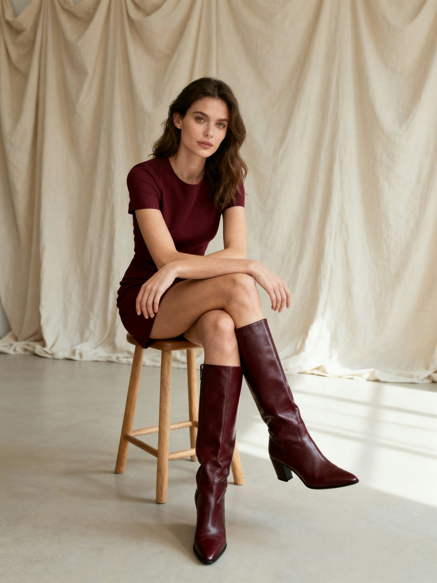 high-end fashion editorial photo, minimal photo studio with soft neutral backdrop, clean and airy composition, soft natural lighting with subtle shadows, sharp focus, realistic textures, luxurious yet effortless atmosphere, refined styling, professional fashion photography, feminine and bold poses, consistent minimal studio setup, photorealistic — model sitting on a wooden stool, wearing sleek knee-high leather boots in deep burgundy, matching minimal mini dress, soft draped fabric in the background, elegant posture, legs crossed, subtle confident gaze