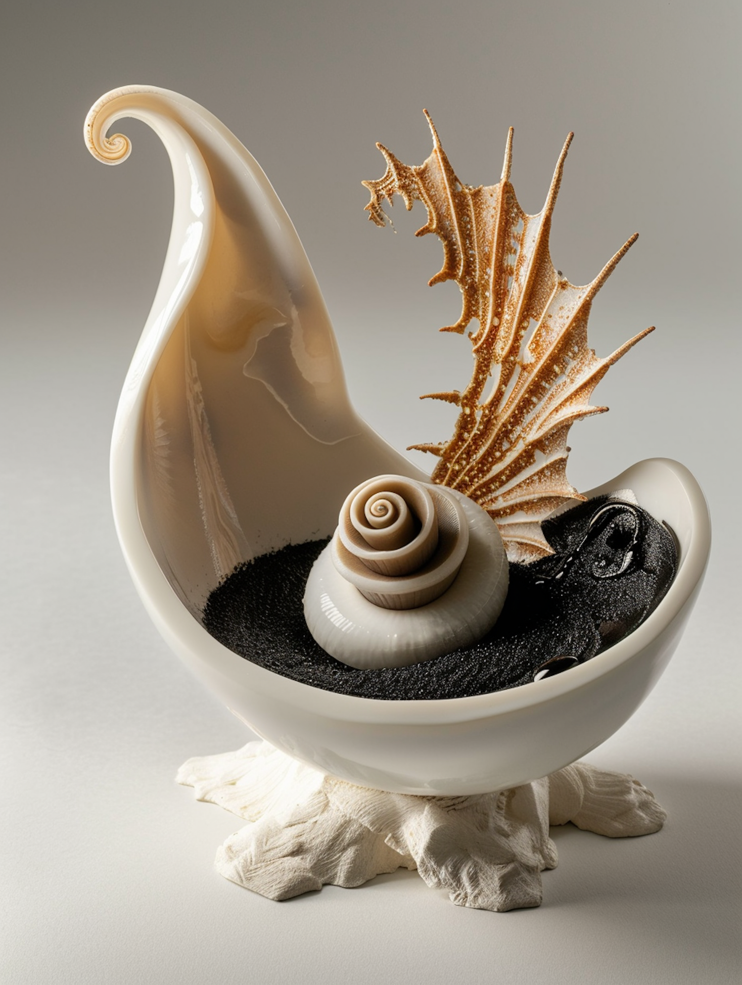 Elegant ceramic shell sculpture with black sand and spiral shell, accented by a spiky leaf structure. A harmonious blend of textures.
