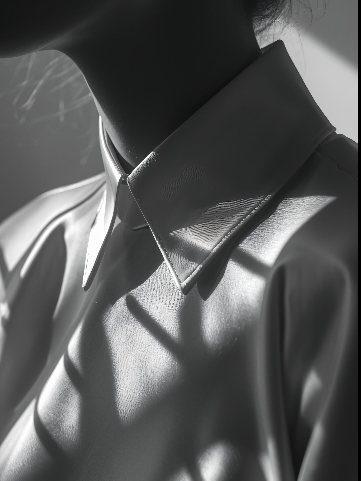 Black-and-white close-up of a collared shirt with dramatic lighting and shadows, emphasizing texture and elegance.